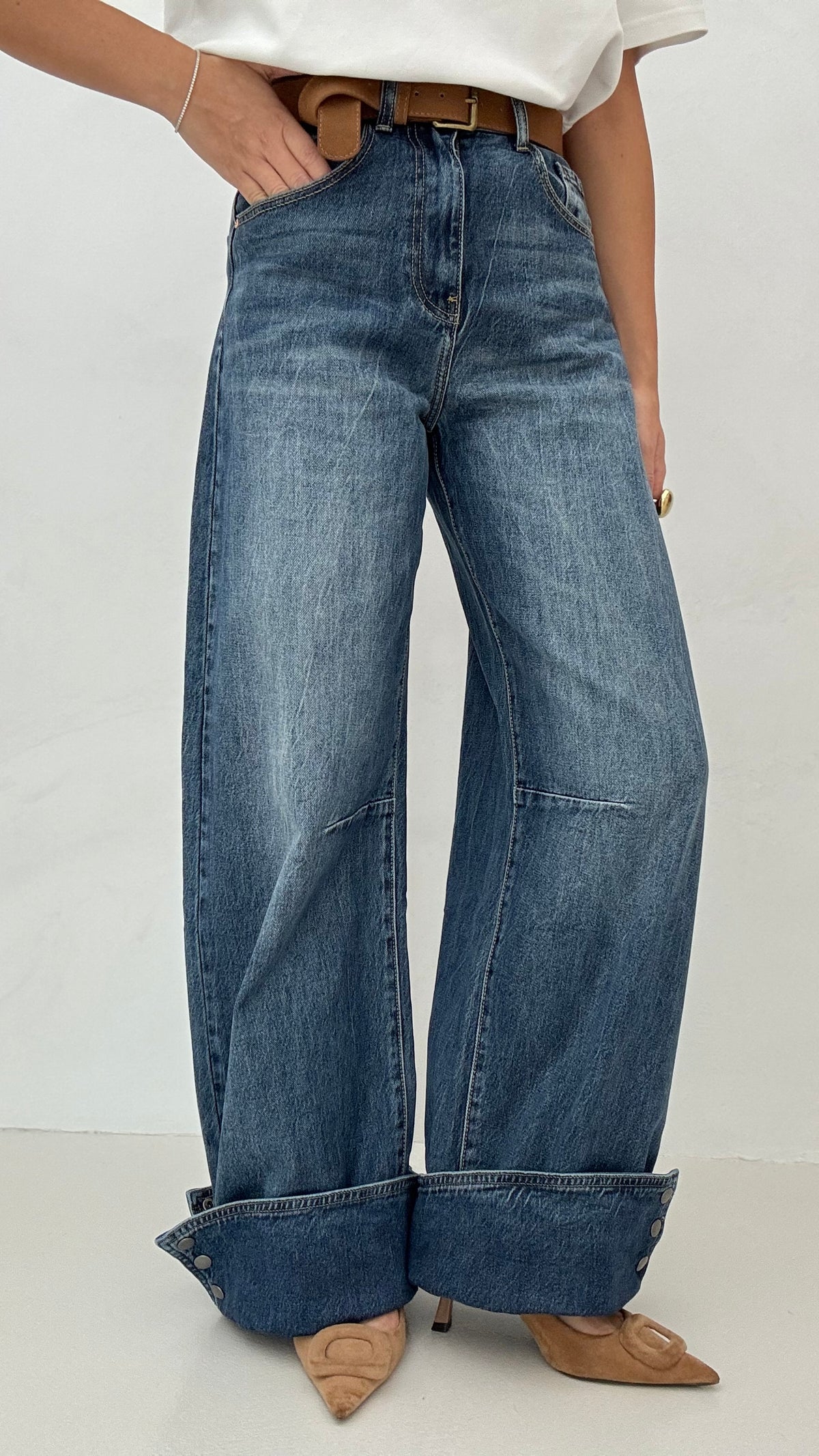 Il jeans non è elasticizzato, consigliamo la taglia regolare per un effetto come in foto, altrimenti consigliamo di acquistare una taglia in più per un effetto più morbido, gamba ampia, chiusura con bottone e zip, piegone con bottoni a clip veri in metallo, cintura inclusa.
