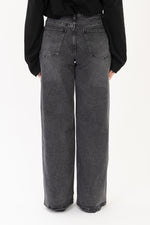 Jeans vita alta poco elasticizzato, gamba larga, chiusura con bottone interno a scomparsa + esterno con zip, leggermente sfrangiato sul fondo, se oscillate tra due taglie si consiglia l’acquisto di una taglia in piu.