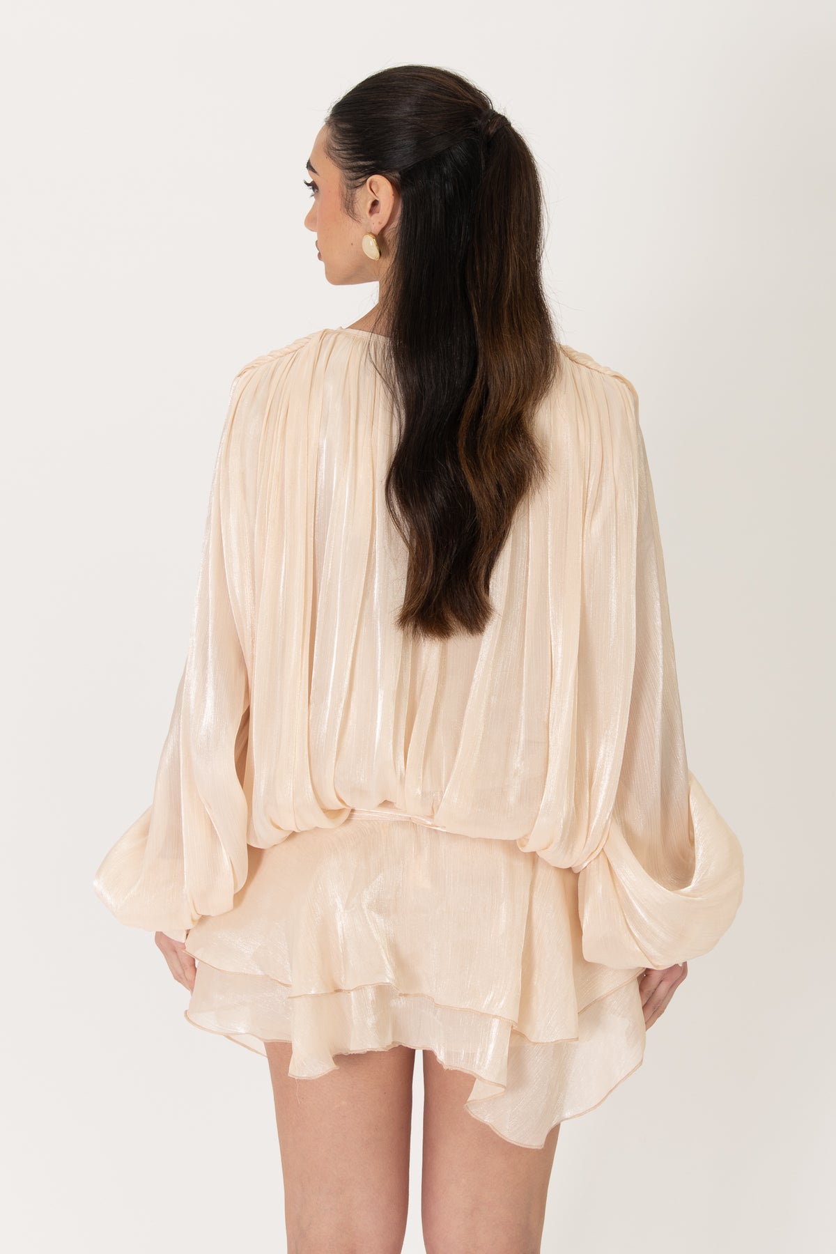Coordinato composto da blusa velata e foderata, poco elasticizzata, chiusura mini bottone sulla nuca, laccetto sul davanti, manica a sbuffo con chiusura bottone sul polso, fusciacca.