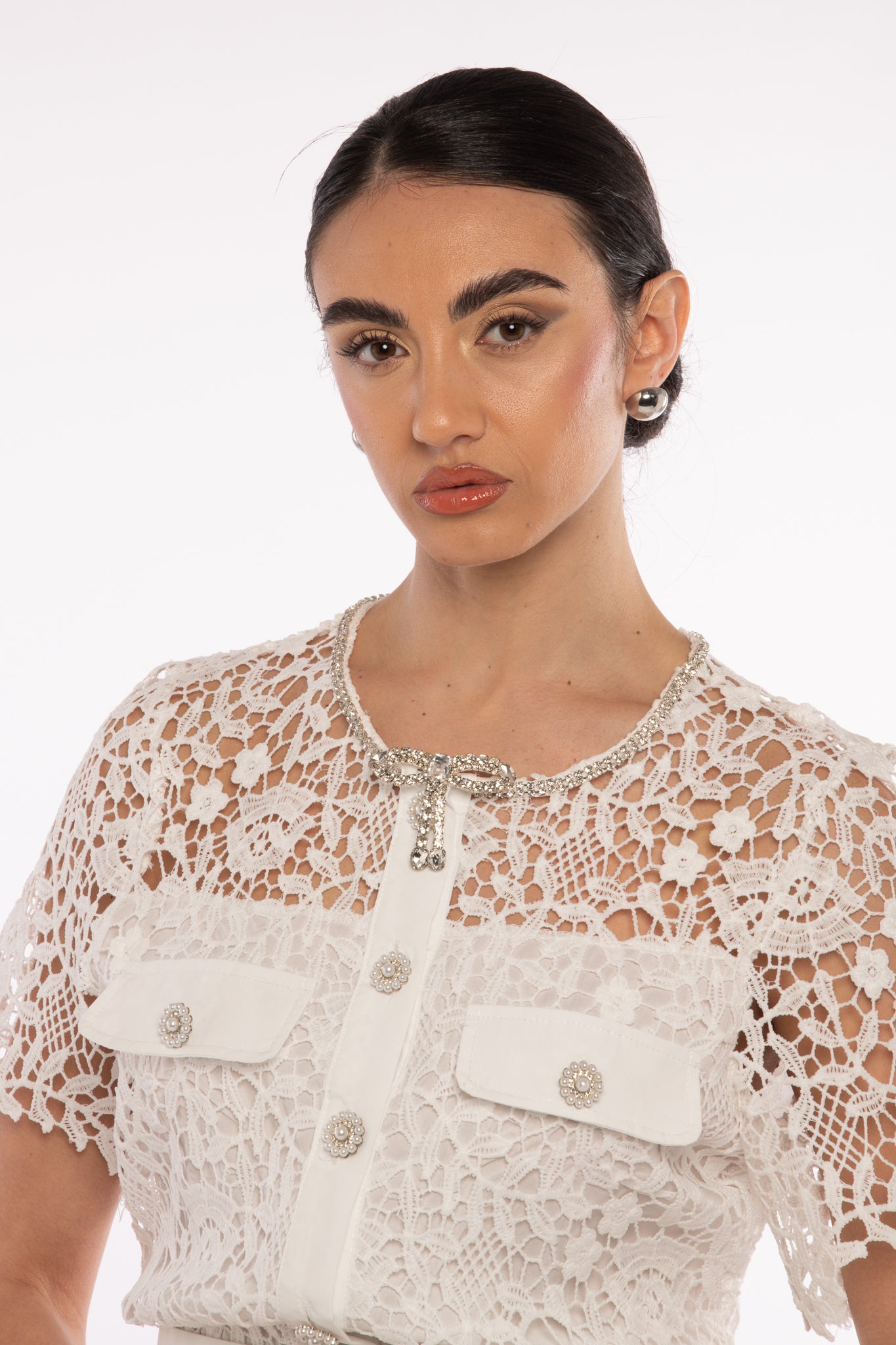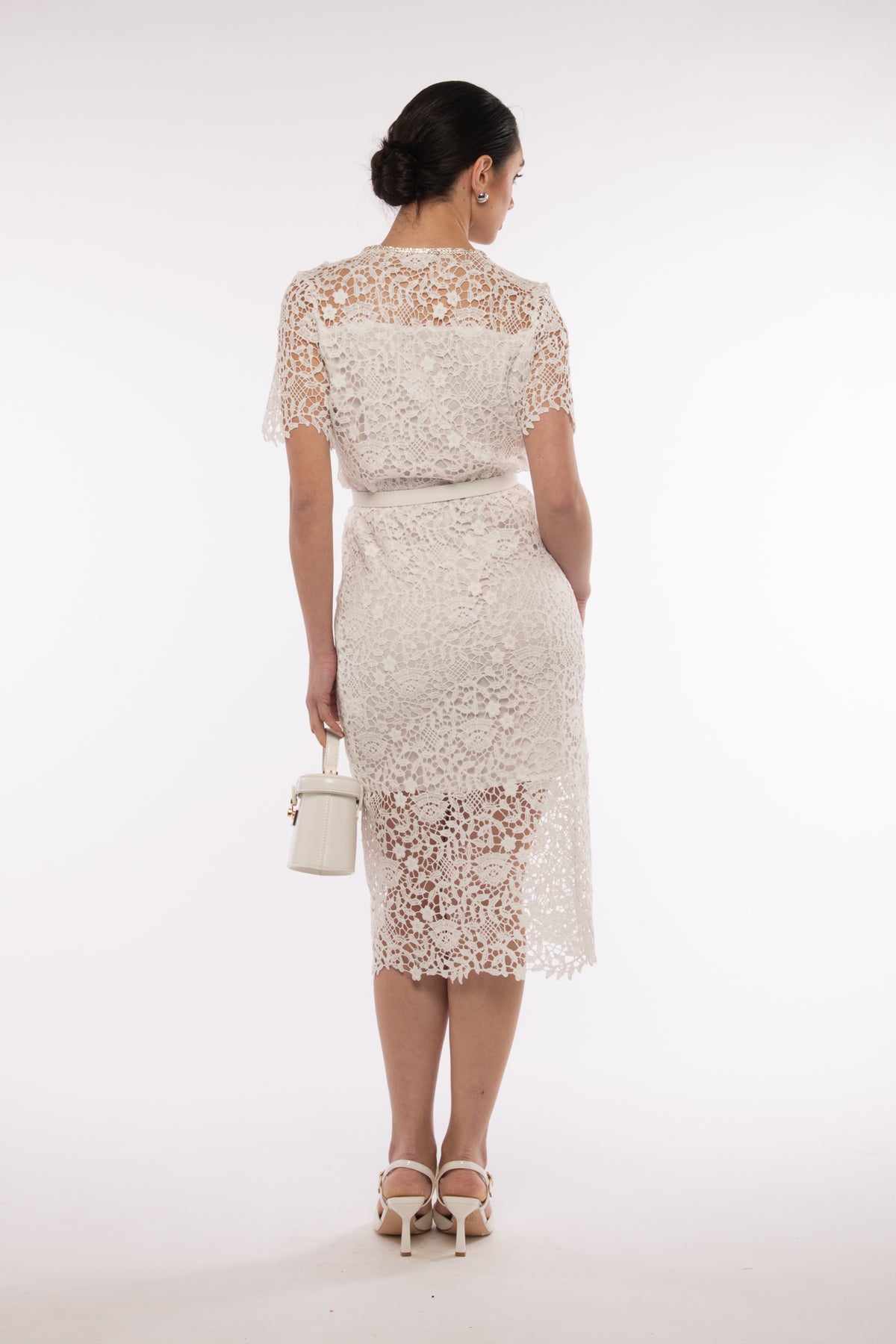 Abito midi in pizzo, poco elasticizzato e fodera interna, mezza manica,dettaglio con bottoni veri con mini perle, passanti laterali e cintura inclusa, girocollo lavorato con mini strass, taschini finti sul davanti, spilla fiocco inclusa e rimovibile.