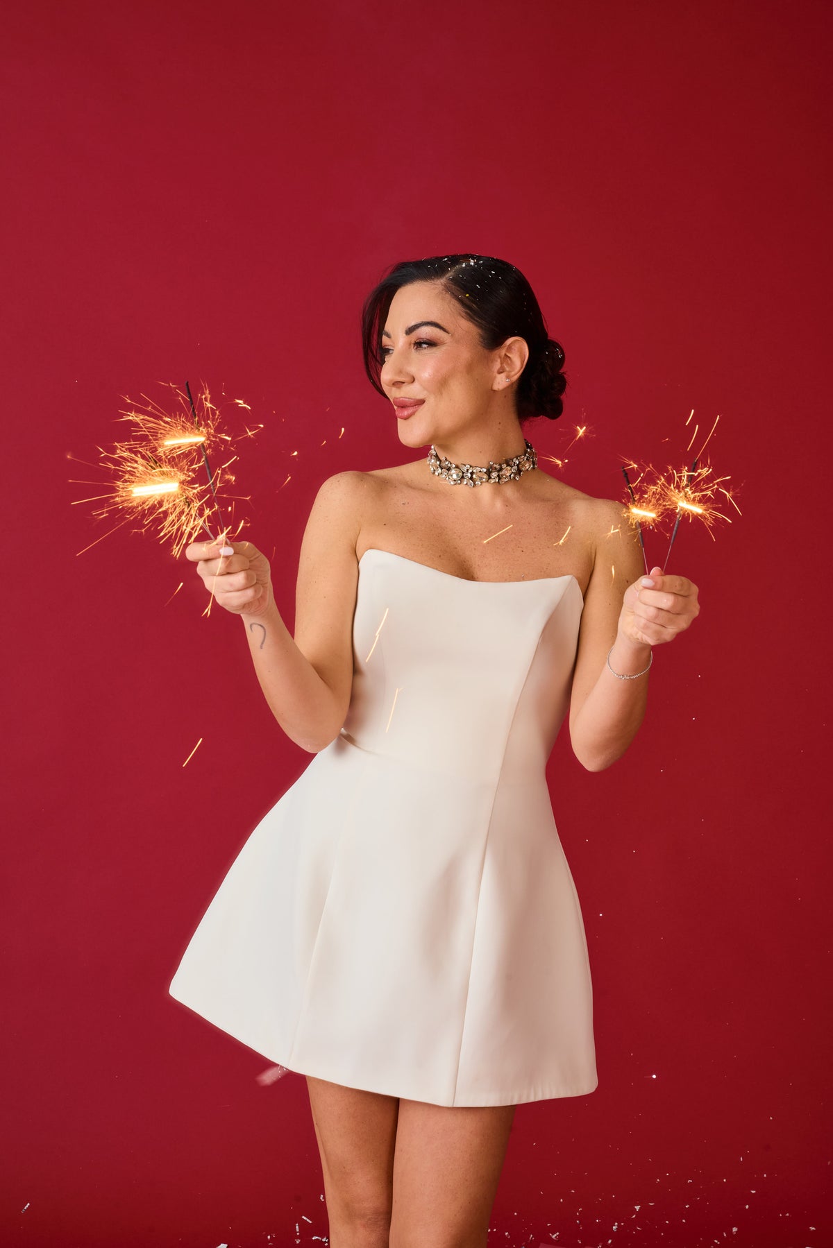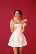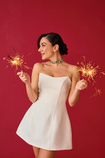 Abito con chiusura zip sul retro, non elasticizzato, scollo a cuore internamente steccato, effetto avvitato, interamente foderato.