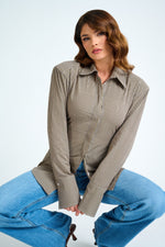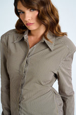 Roberta è alta 1.63, solitamente indossa taglia XS, la camicia è taglia unica, poco elasticizzata,  bottoni sul davanti ,lunghezza regolare, maxi polsino con bottone,effetto avvitato con passante sul retro e mini cinturino regolabile, la cravatta è inclusa.