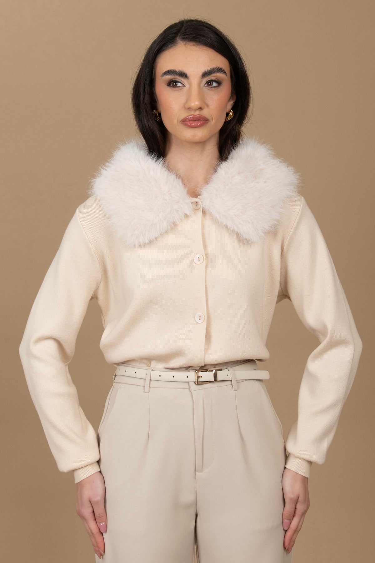 Prezzo unitario perLa modella è alta 1.69, solitamente indossa taglia S il cardigan è taglia unica, veste da una XS ad una taglia L, chiusura con bottoni presenta sul collo un pellicciotto rimovibile , la lunghezza è regolare.