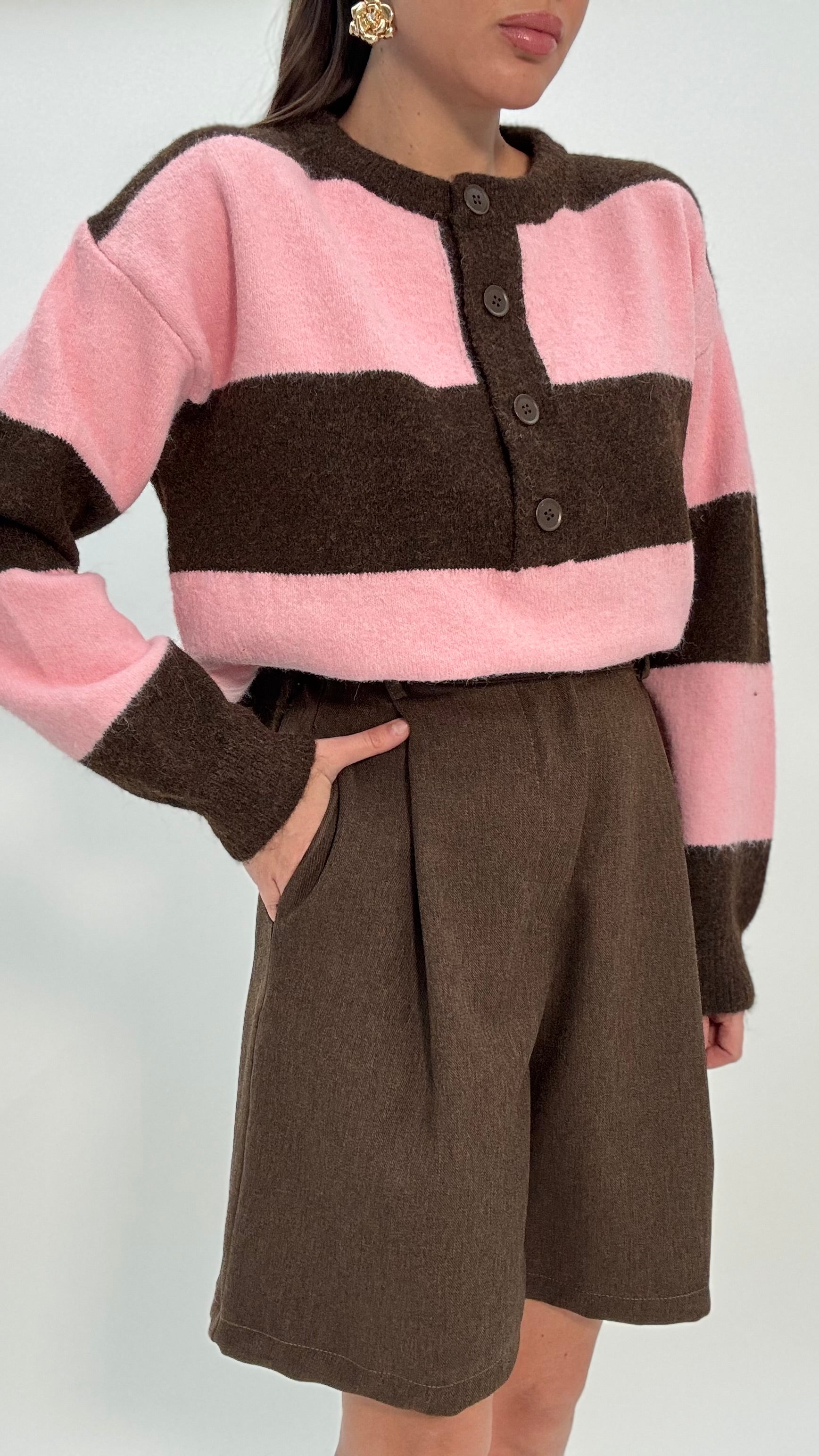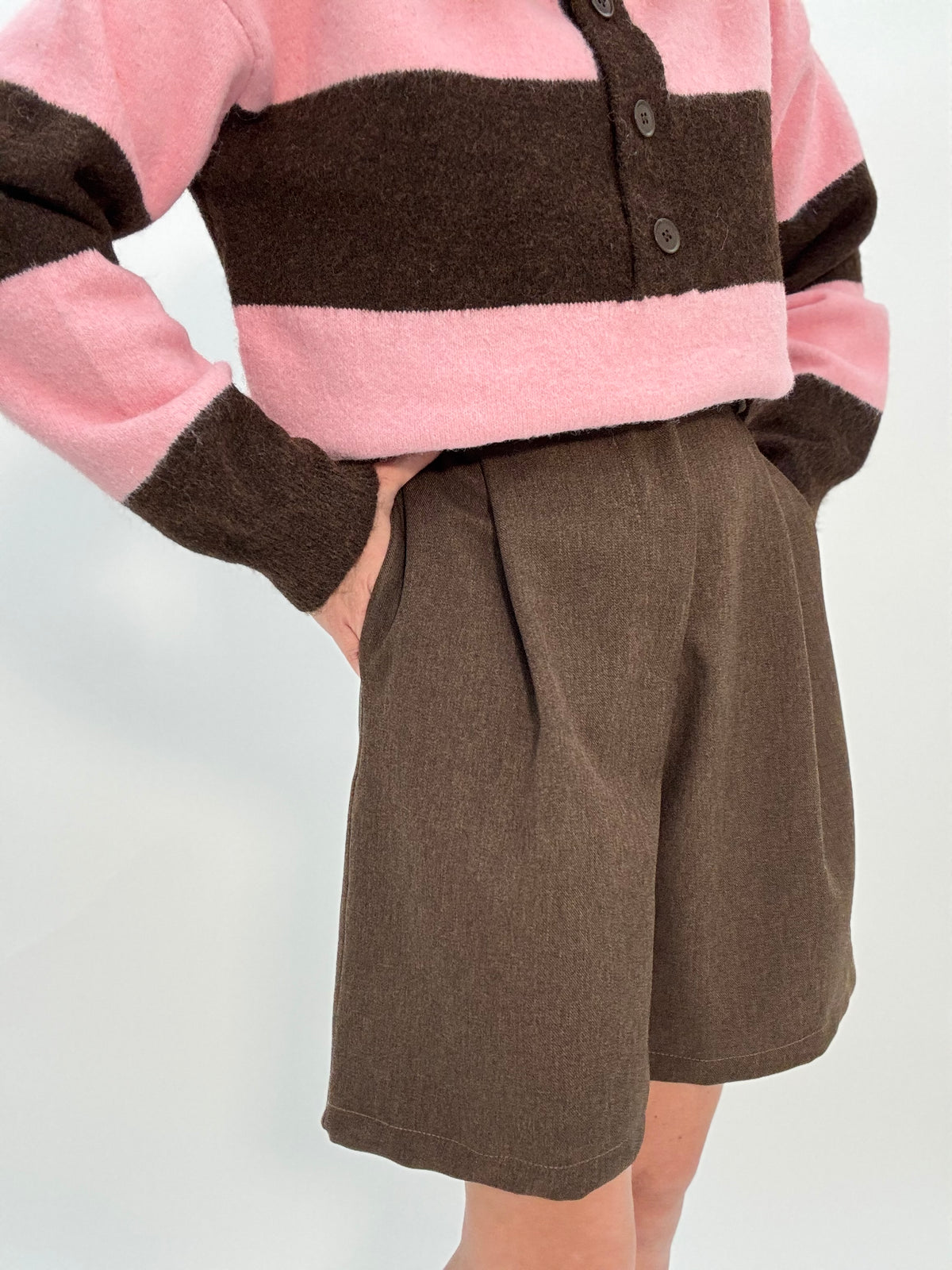 Robi è alta 1.63, solitamente indossa taglia XS, del bermuda indossa taglia S, la differenza tra le taglie è minima, gamba morbida, elastico sul retro, chiusura con bottone rivestito e zip.