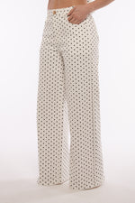Pantalone in Denim bianco, internamente non foderato, chiusura bottone oro e zip, gamba morbida ed ampia ,in vita riporta dei passanti.