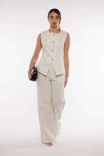 Coordinato composto gilet effetto avvitato, internamente non foderato, in Denim bianco poco elasticizzato, chiusura bottoni oro, lunghezza regolare, tasche finte sul davanti.