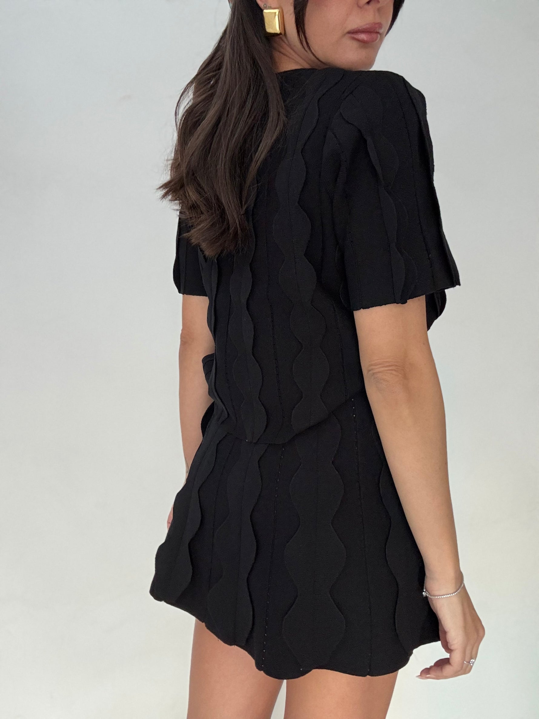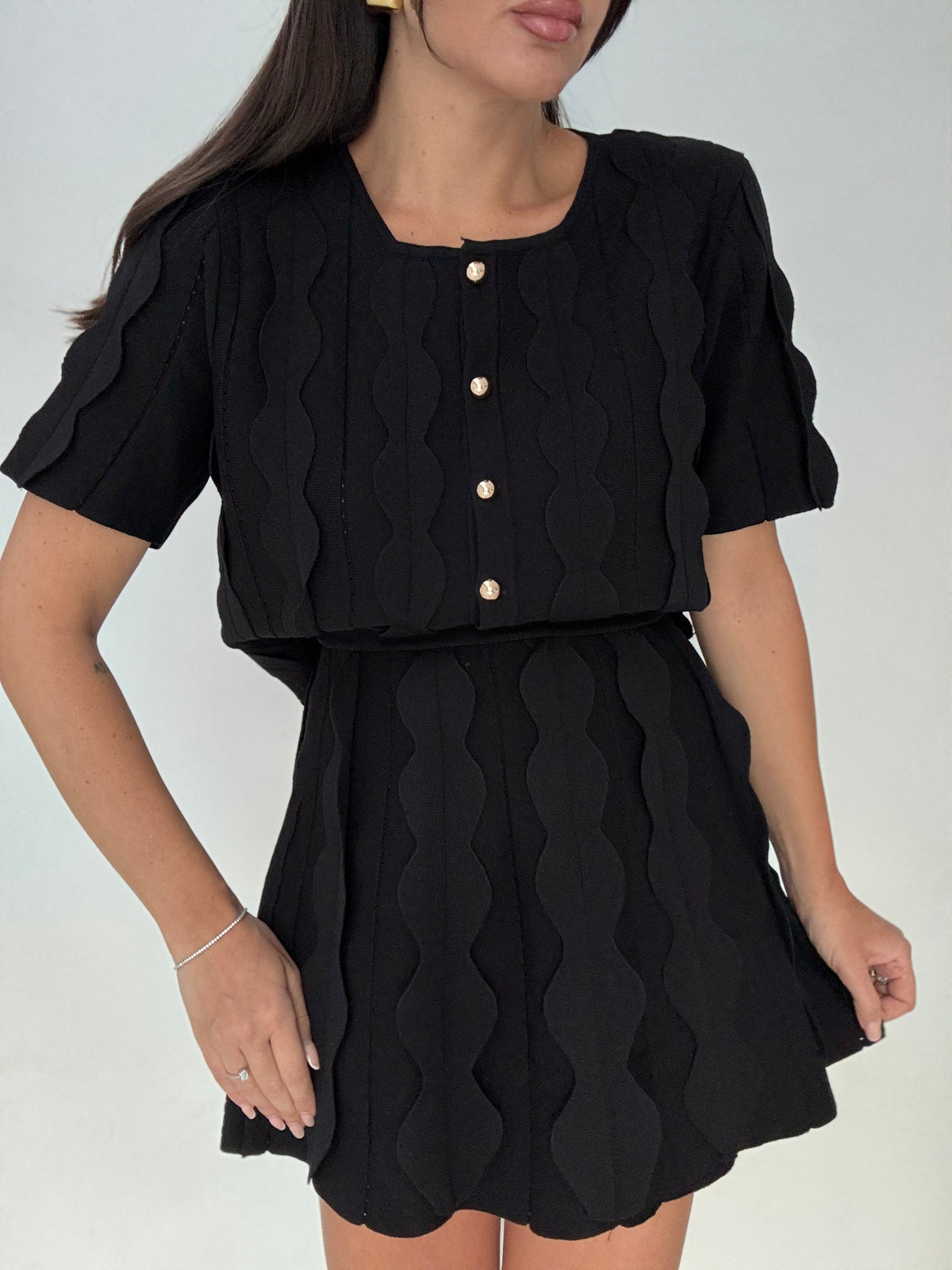 Coordinato composto cardigan con bottoni oro, leggermente crop, dettaglio onde sul davanti e sul retro, leggermente elasticizzato e internamente non foderato.