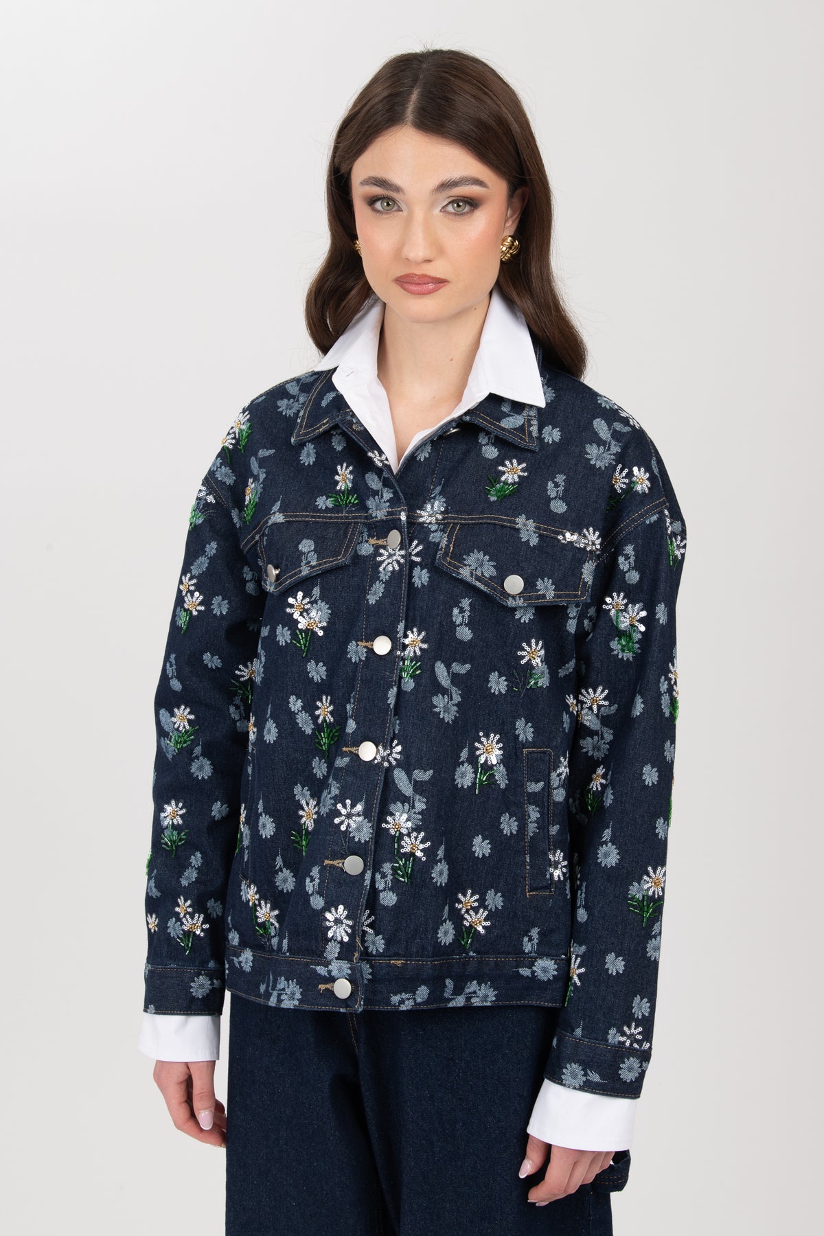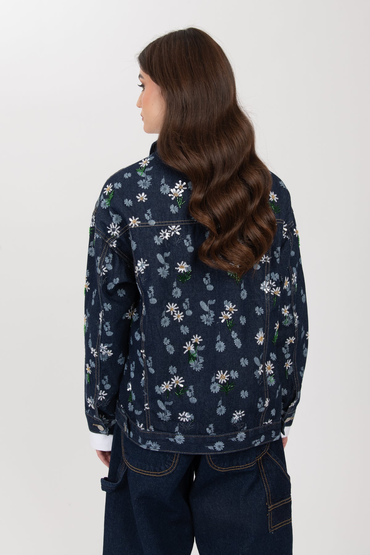 GI acca taglia unica in denim, interamente non foderato , dettaglimini margherite in paillettes sia sul davanti che sul retro, lunghezza regolare, non Elasticizzato, chiusura con bottoni, veste da taglia XS ad una L regolare