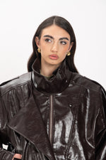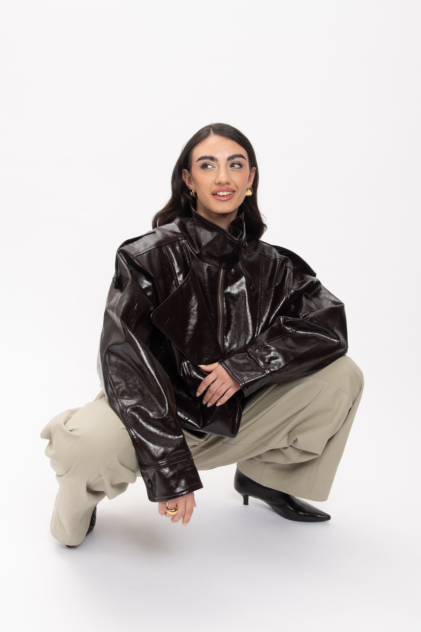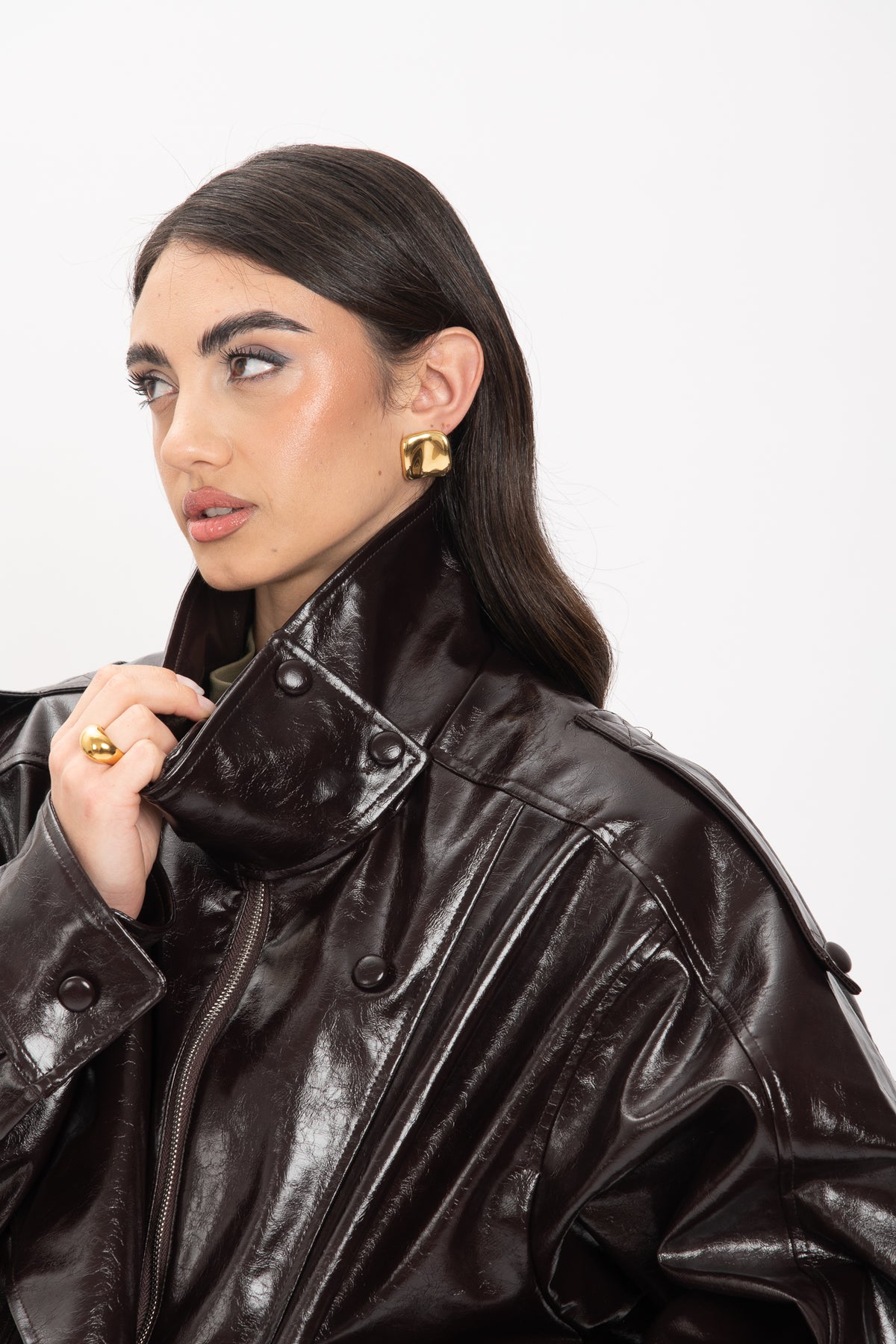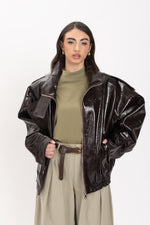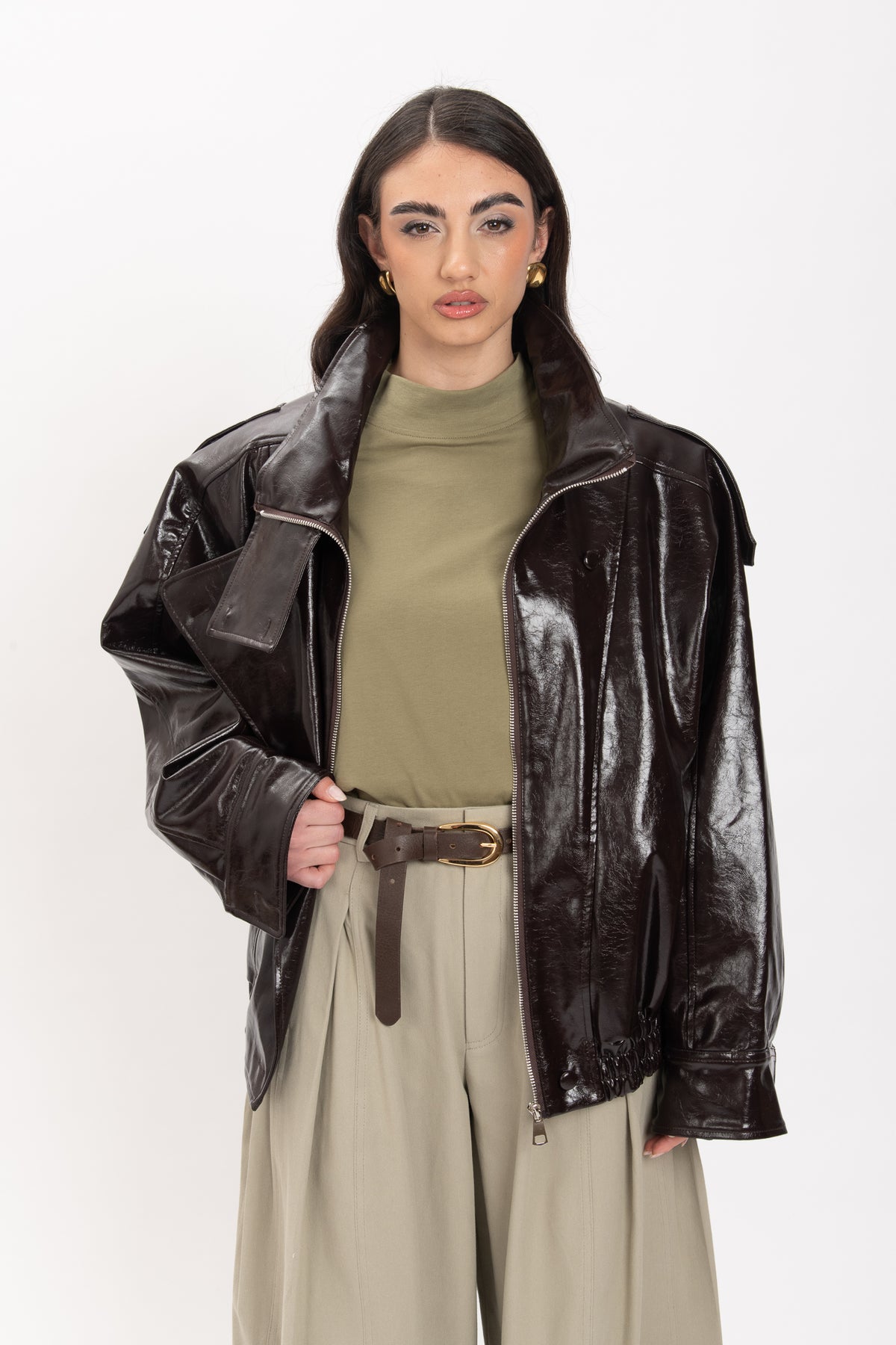 Bomber vernice taglia unica, lunghezza regolare, poco elasticizzato, imbottito internamente, elastico sul fondo, chiusura con zip e bottoni asimmetrici, tasche vere sul davanti,collo alto .