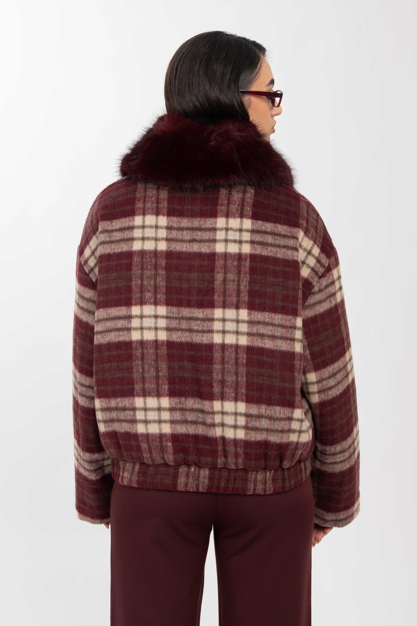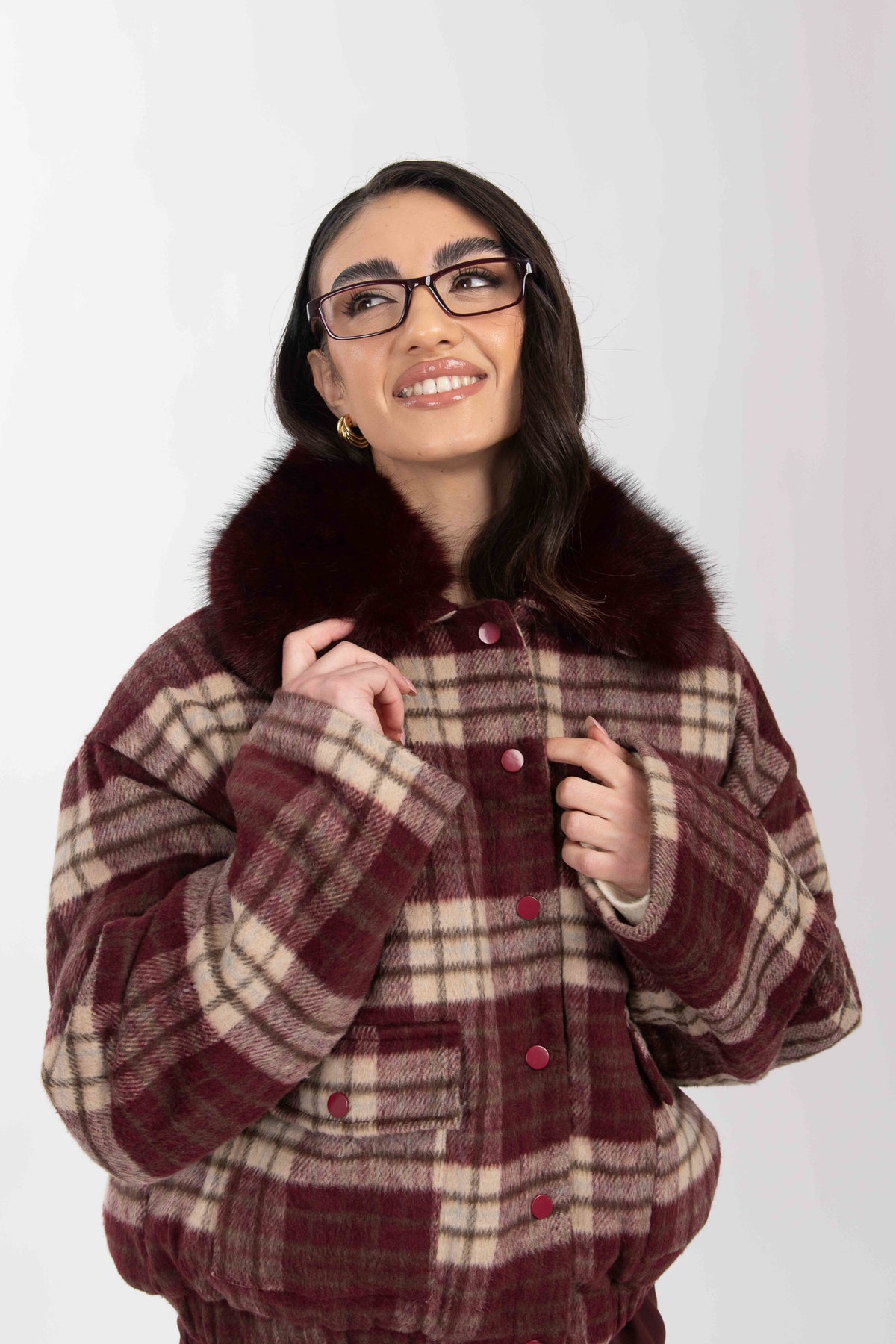 Bomber taglia unica, lunghezza regolare, poco elasticizzato, imbottito internamente, elastico sul fondo e sul polso, chiusura con bottoni a ciappa, tasche vere sul davanti,collo alto e pelliccia rimovibile.