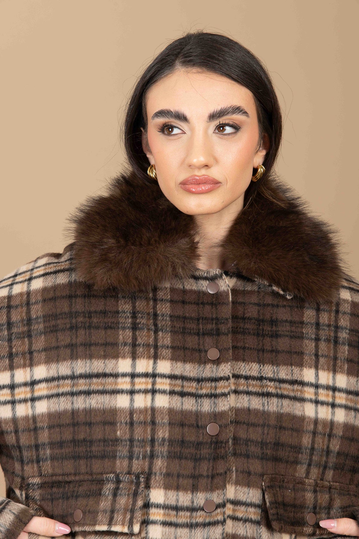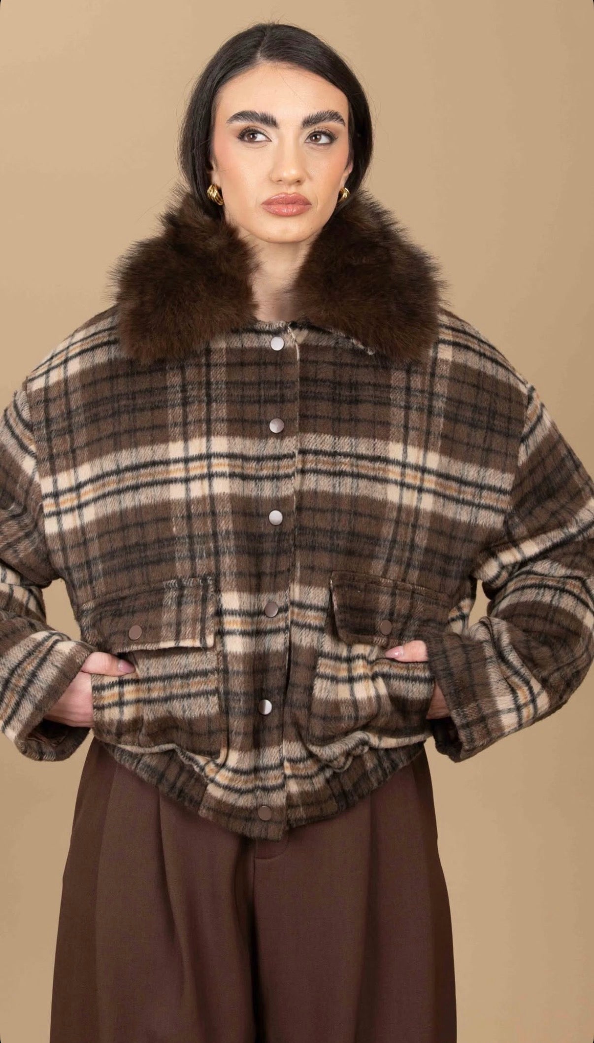 Bomber taglia unica, lunghezza regolare, poco elasticizzato, imbottito internamente, elastico sul fondo e sul polso, chiusura con bottoni a ciappa, tasche vere sul davanti,collo alto e pelliccia rimovibile.