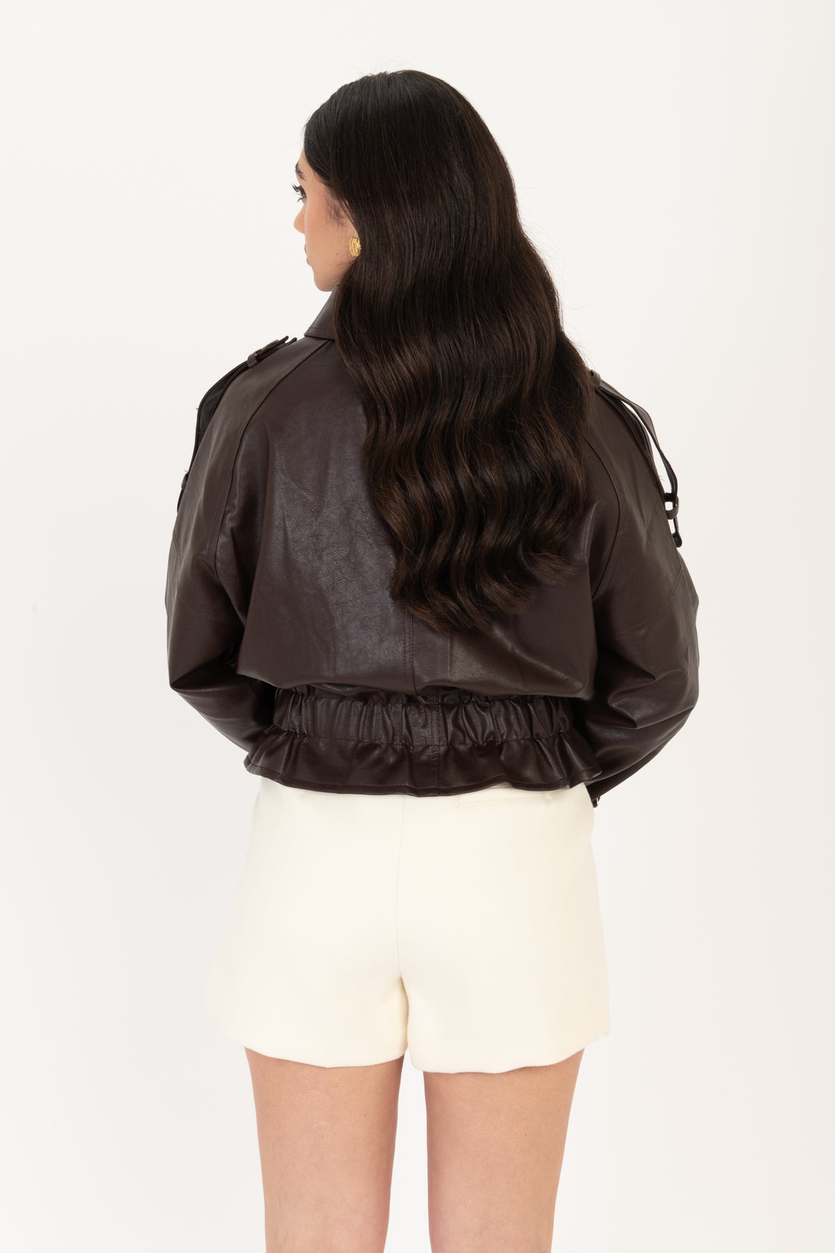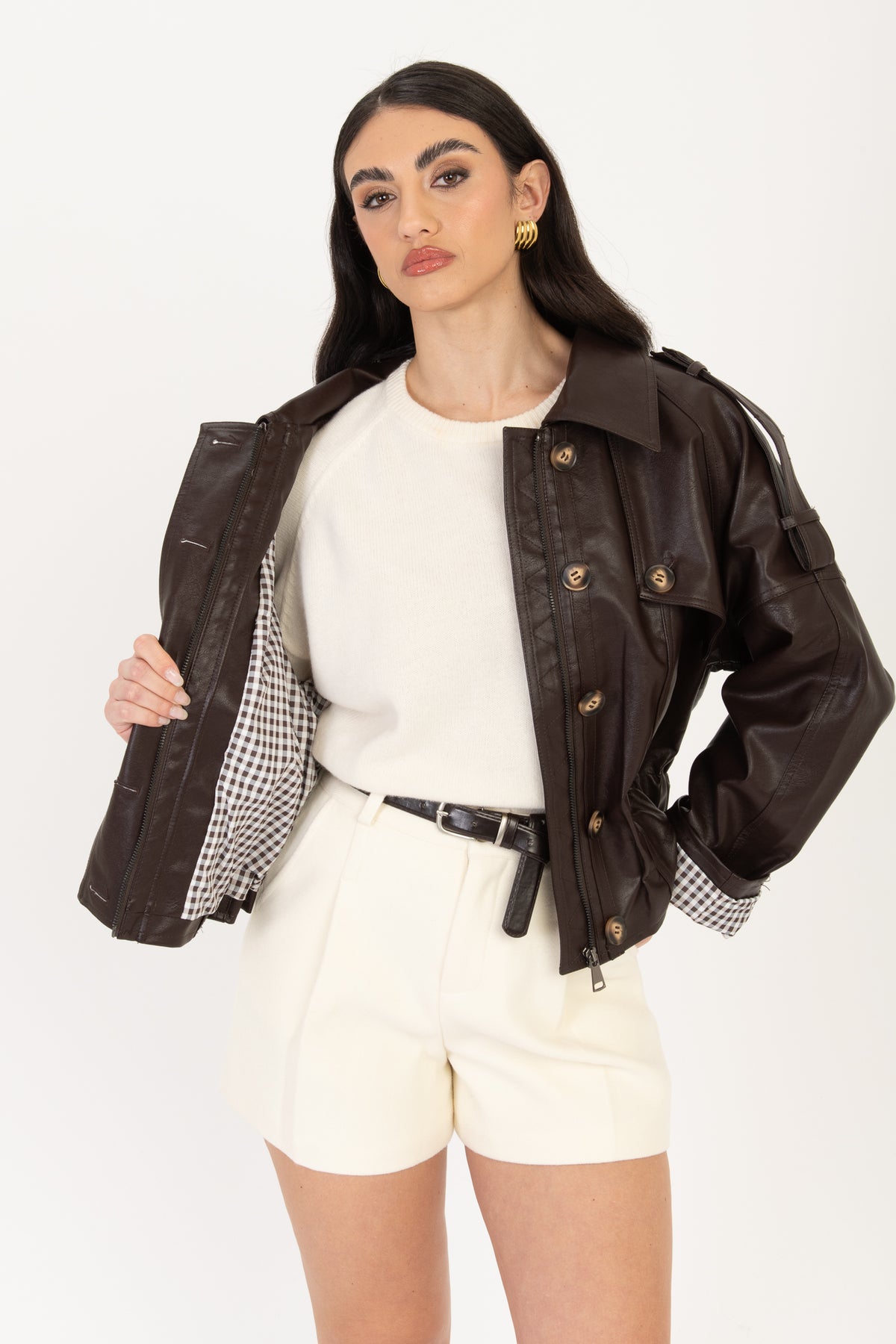 Del Trench in ecopelle indossa taglia S/M chiusura con bottoni e zip. Elastico sul fondo, tasche vere laterali, foderato internamente a fantasia a quadri.