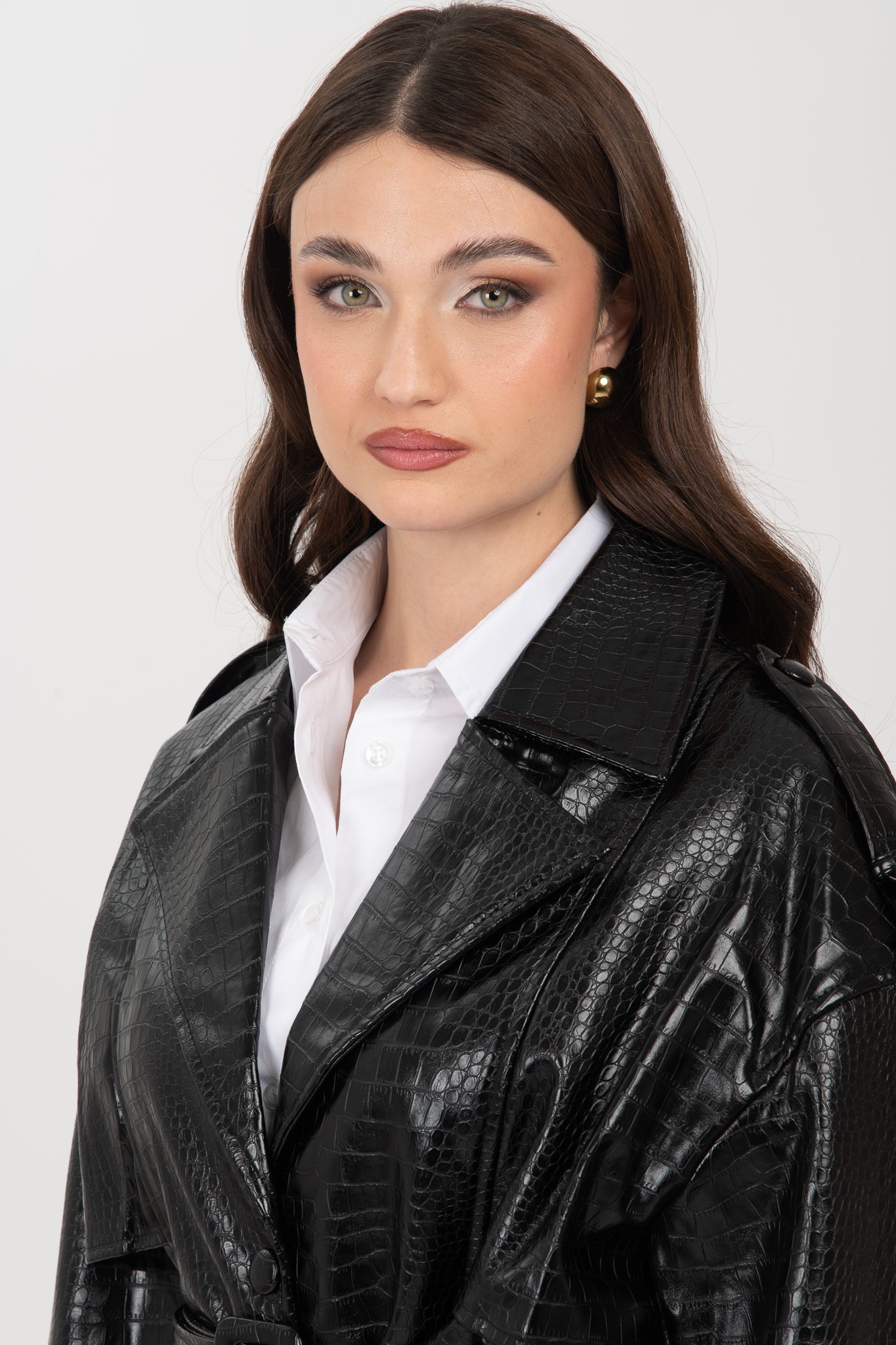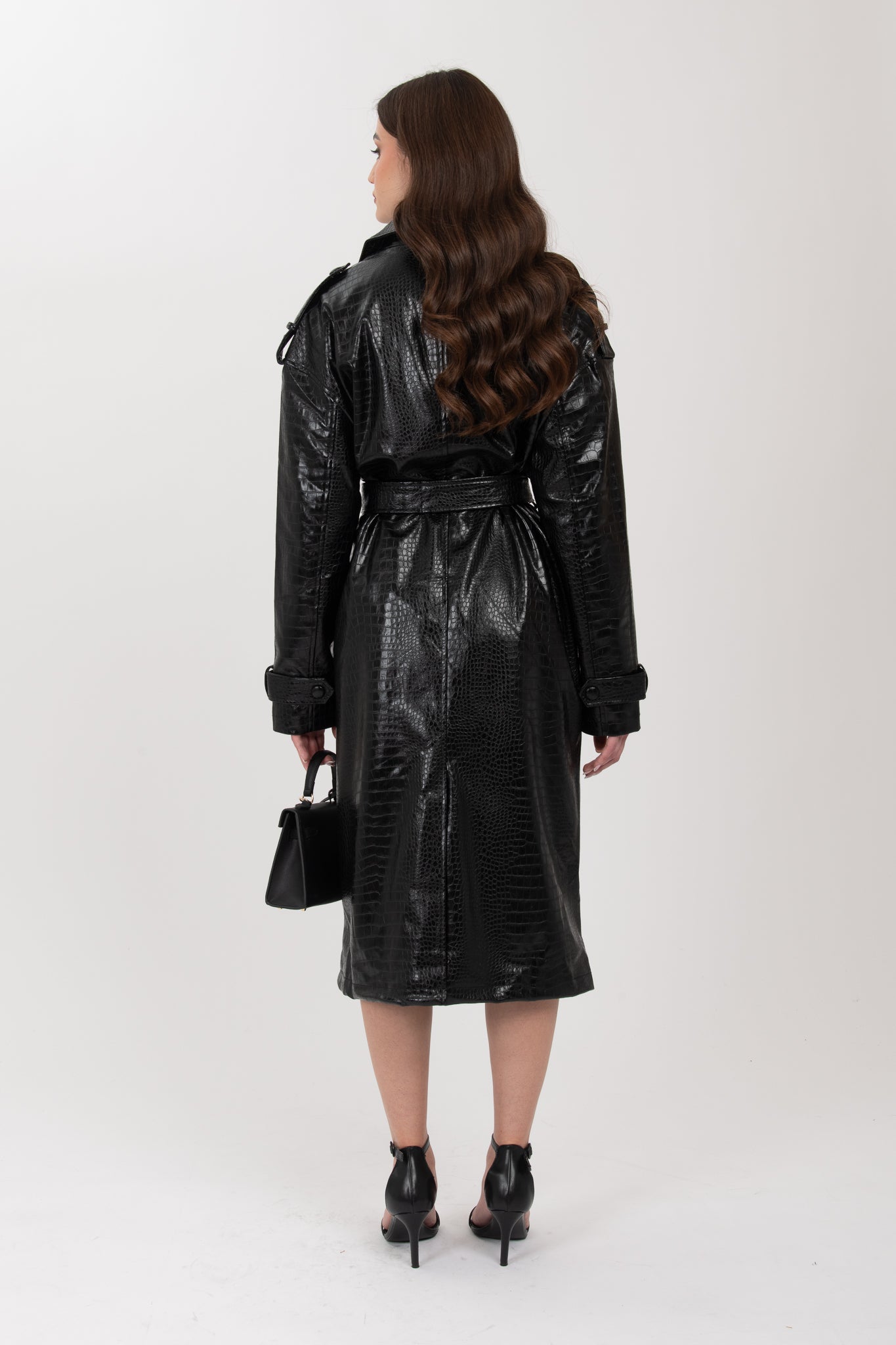 Trench lungo in ecopelle taglia unica, chiusura con bottoni sul davanti, cintura in vita con passanti, sul davanti presenta doppie tasche vere, foderato internamente.