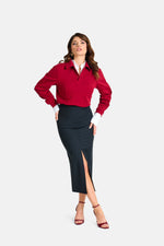 Roberta solitamente indossa taglia XS ed è alta 1.63, della gonna indossa taglia S. Carmela é alta 1.75 e anche lei indossa taglia S, la gonna ha lo spacco sul davanti, non è elasticizzata, bustino alto, zip sul retro.