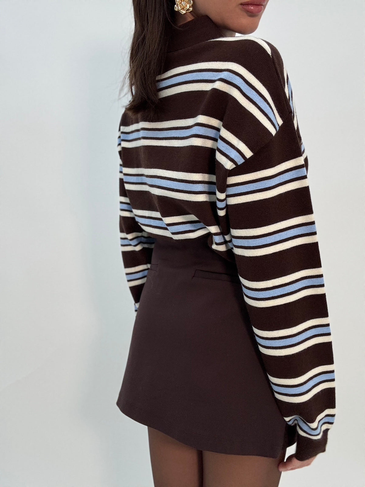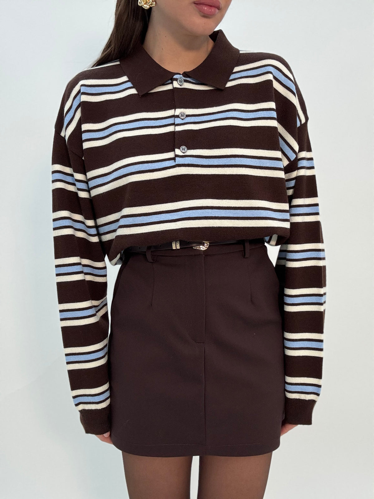 Gonna mini leggermente elasticizzata con pantaloncino interno, cintura inclusa, tasche sul davanti e sul retro finte, chiusura con zip e gancetto, si consiglia l’acquisto di una taglia in più e adatta fino ad una altezza di 1,70.