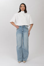 Il jeans è leggermente elasticizzato, consigliamo la taglia regolare per un effetto come in foto, altrimenti consigliamo di acquistare una taglia in più per un effetto più morbido, gamba ampia, chiusura con bottone e zip.