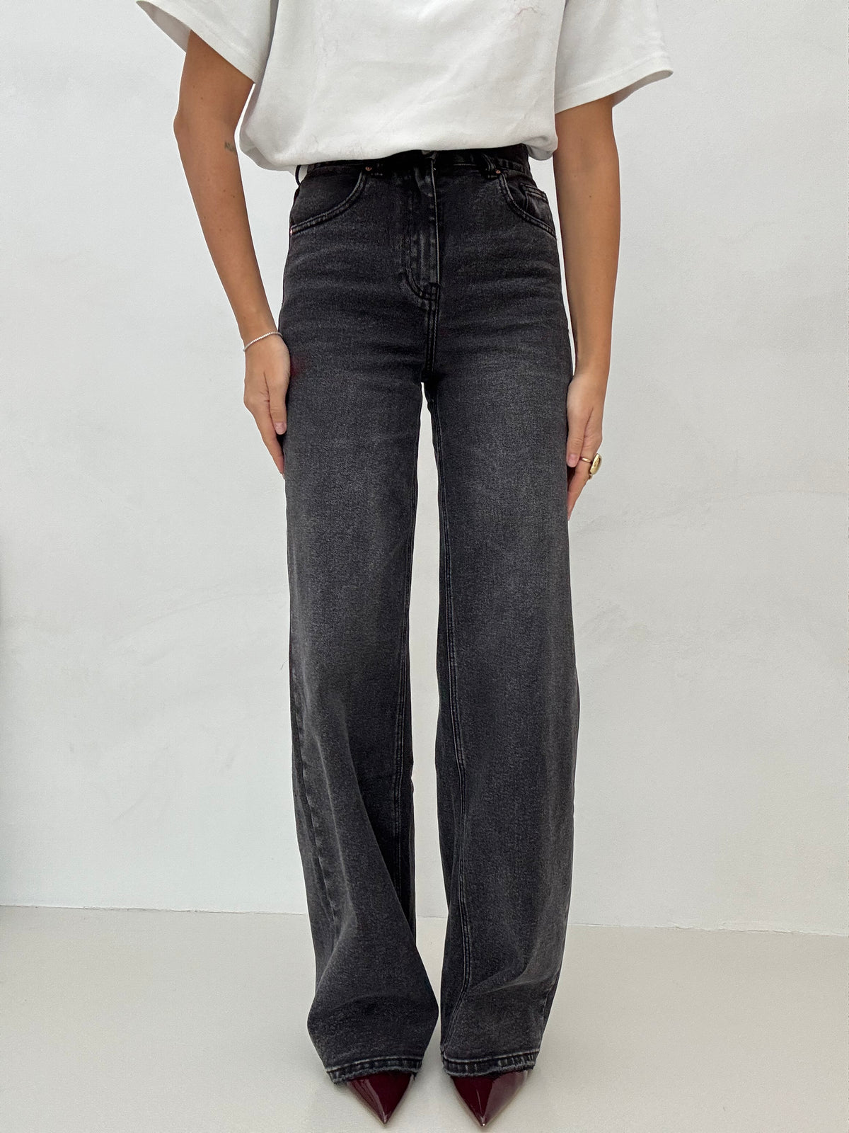 Il jeans non è elasticizzato, consigliamo la taglia regolare per un effetto come in foto, altrimenti consigliamo di acquistare una taglia in più per un effetto più morbido, gamba ampia, chiusura con bottone e zip.