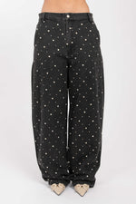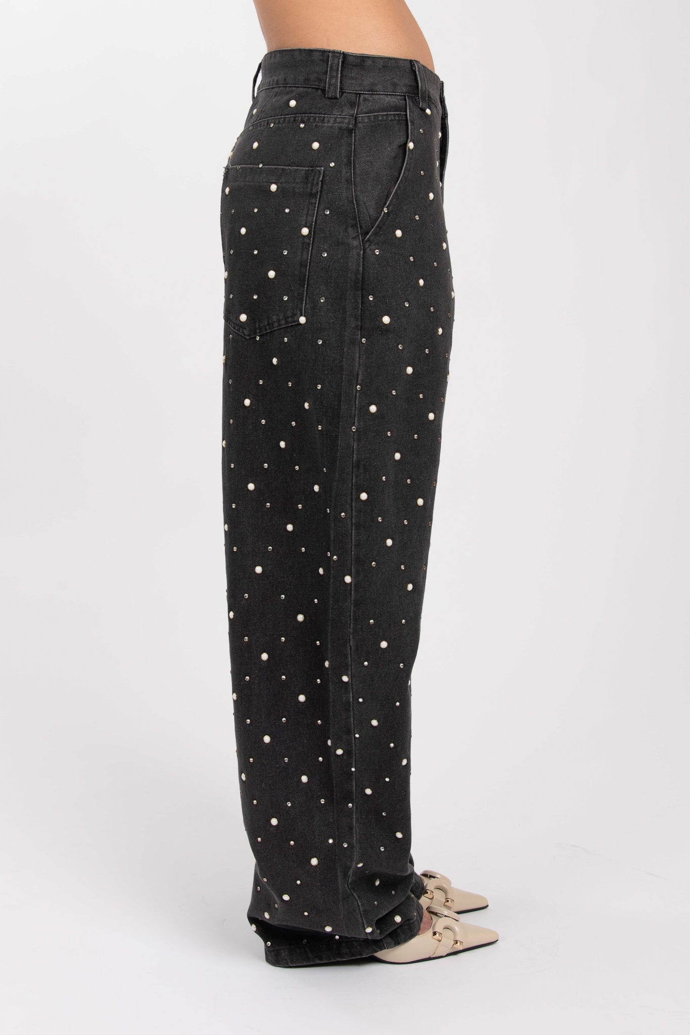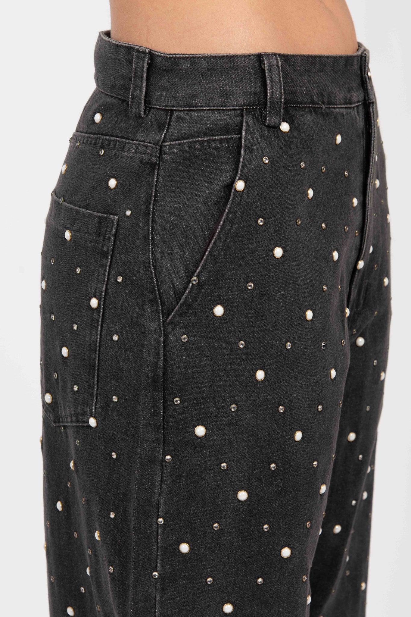 Jeans vita alta con chiusura bottone e zip, gamba morbida effetto ballon, non elasticizzato, dettaglio mini strass e perle sia sul davanti che sul resto.