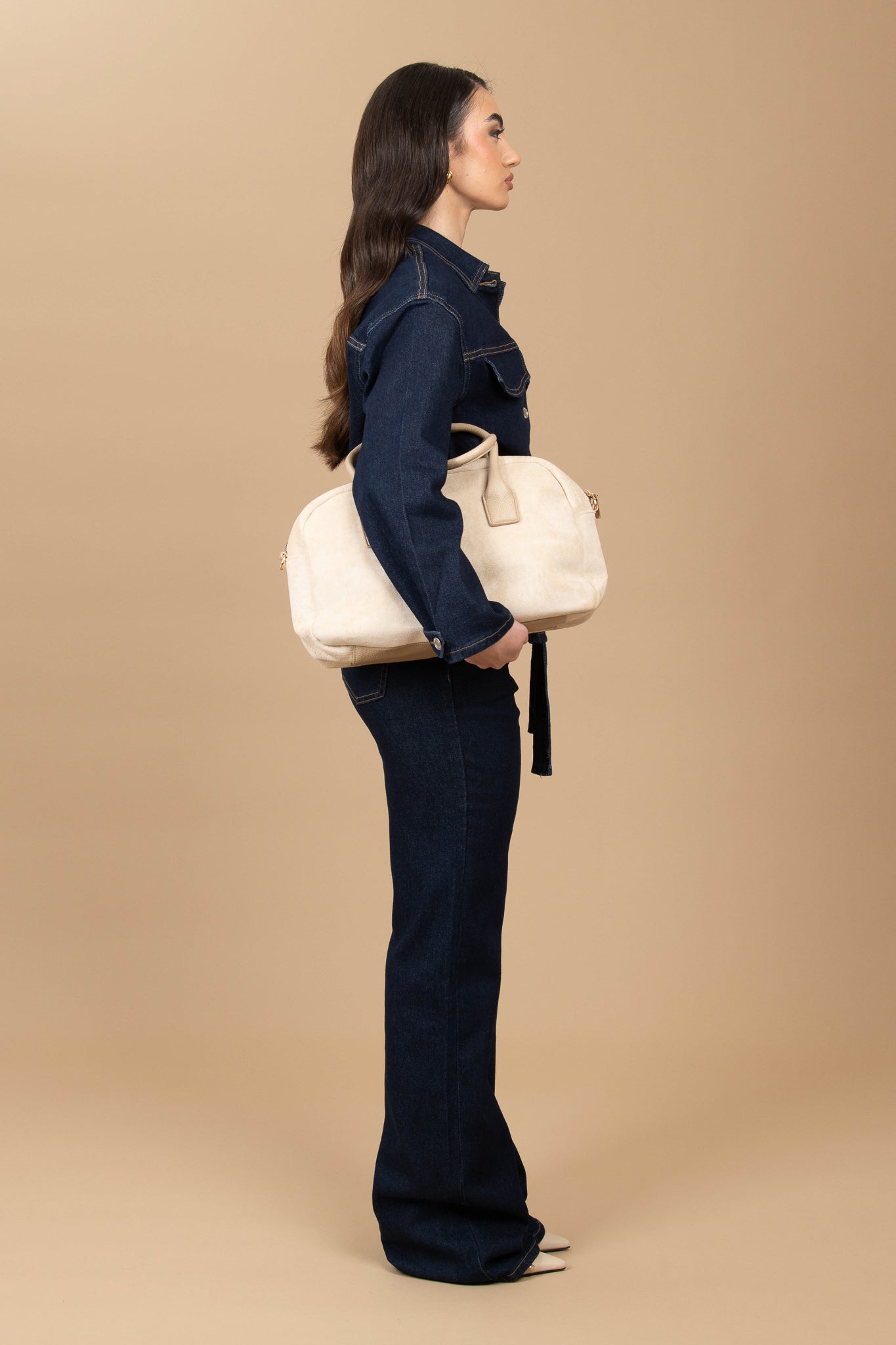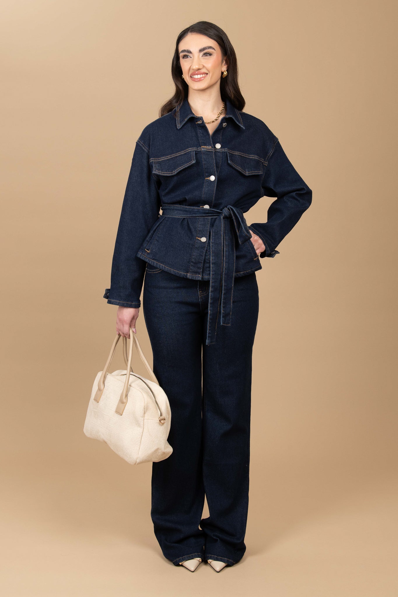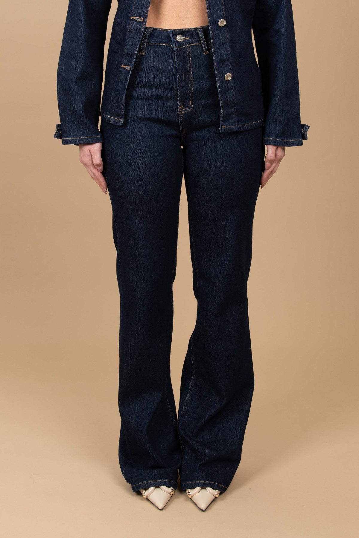 Il jeans non è elasticizzato, consigliamo la taglia regolare per un effetto come in foto, altrimenti consigliamo di acquistare una taglia in più per un effetto più morbido, gamba ampia, chiusura con bottone e zip. Tasche vere sul retro e sul davanti