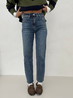 Jeans vita alta non elasticizzato, gamba dritta, chiusura con bottone e zip, tasche vere,taglio vivo,per un effetto più morbido acquistare una taglia in più.