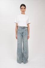 Il jeans è elasticizzato, consigliamo la taglia regolare per un effetto come in foto, altrimenti consigliamo di acquistare una taglia in più per un effetto più morbido, gamba ampia, chiusura con bottone e zip.