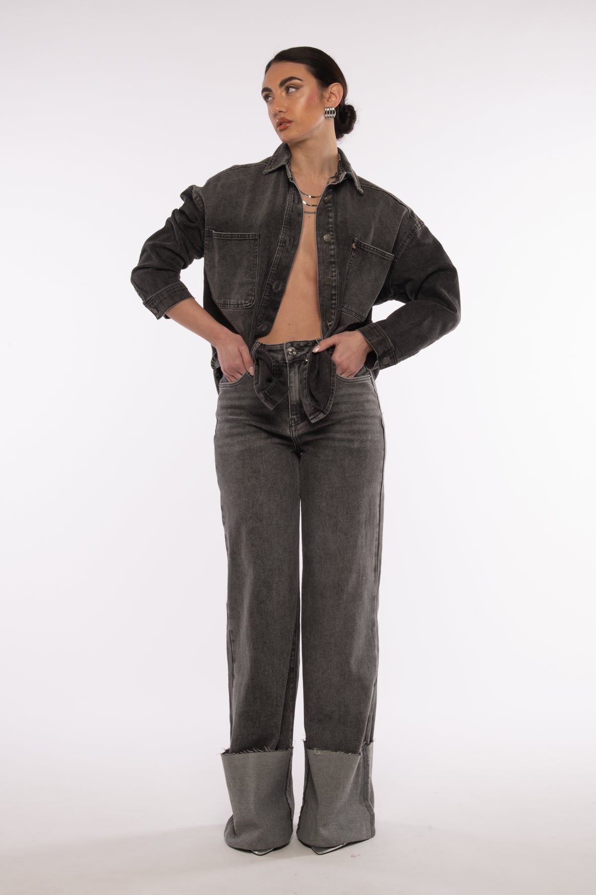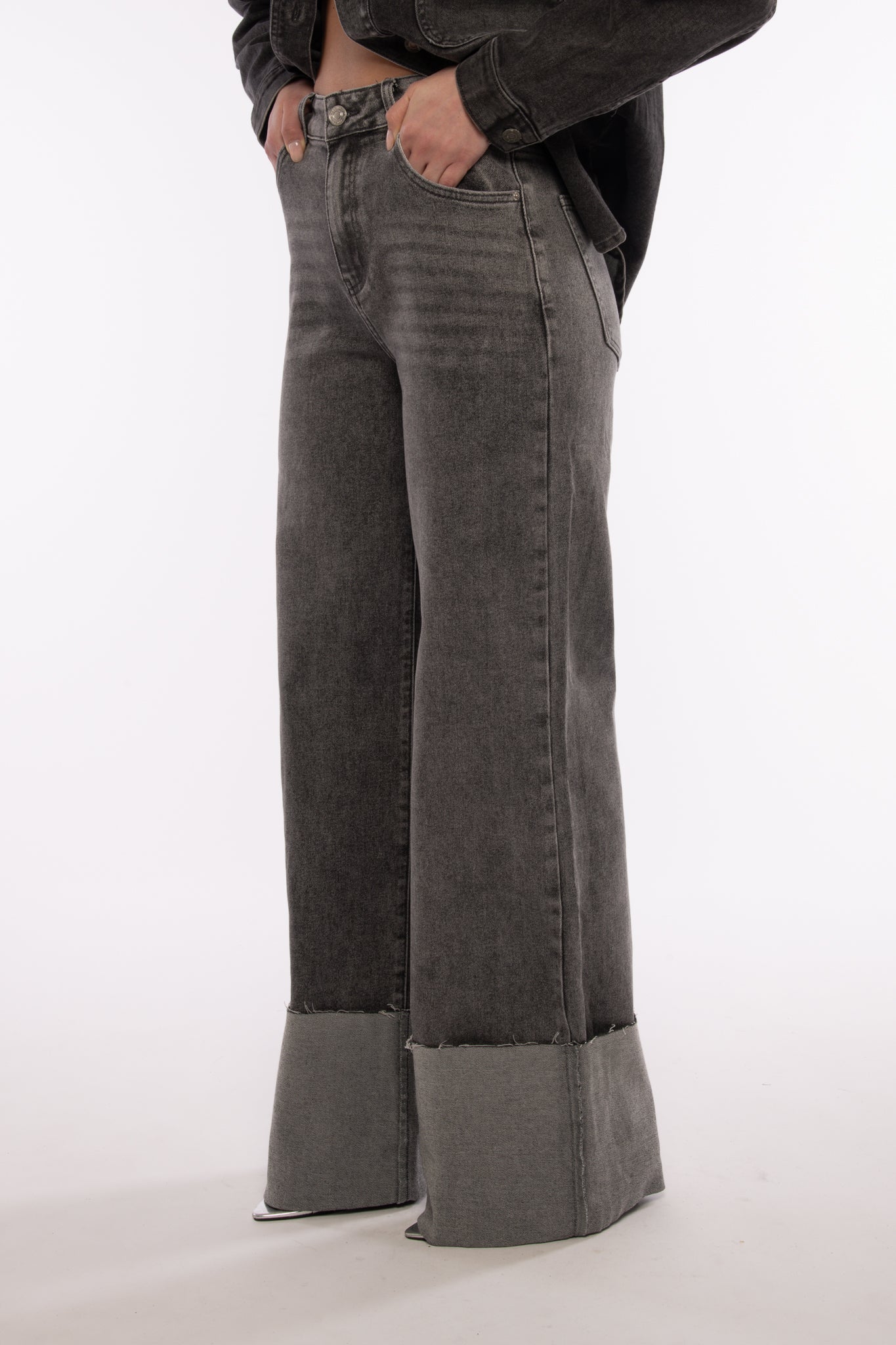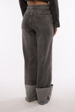 Jeans vita alta con maxi piegone sul fondo non rimovibile, poco elasticizzato, gamba leggermente morbida, chiusura zip e bottone sul davanti.