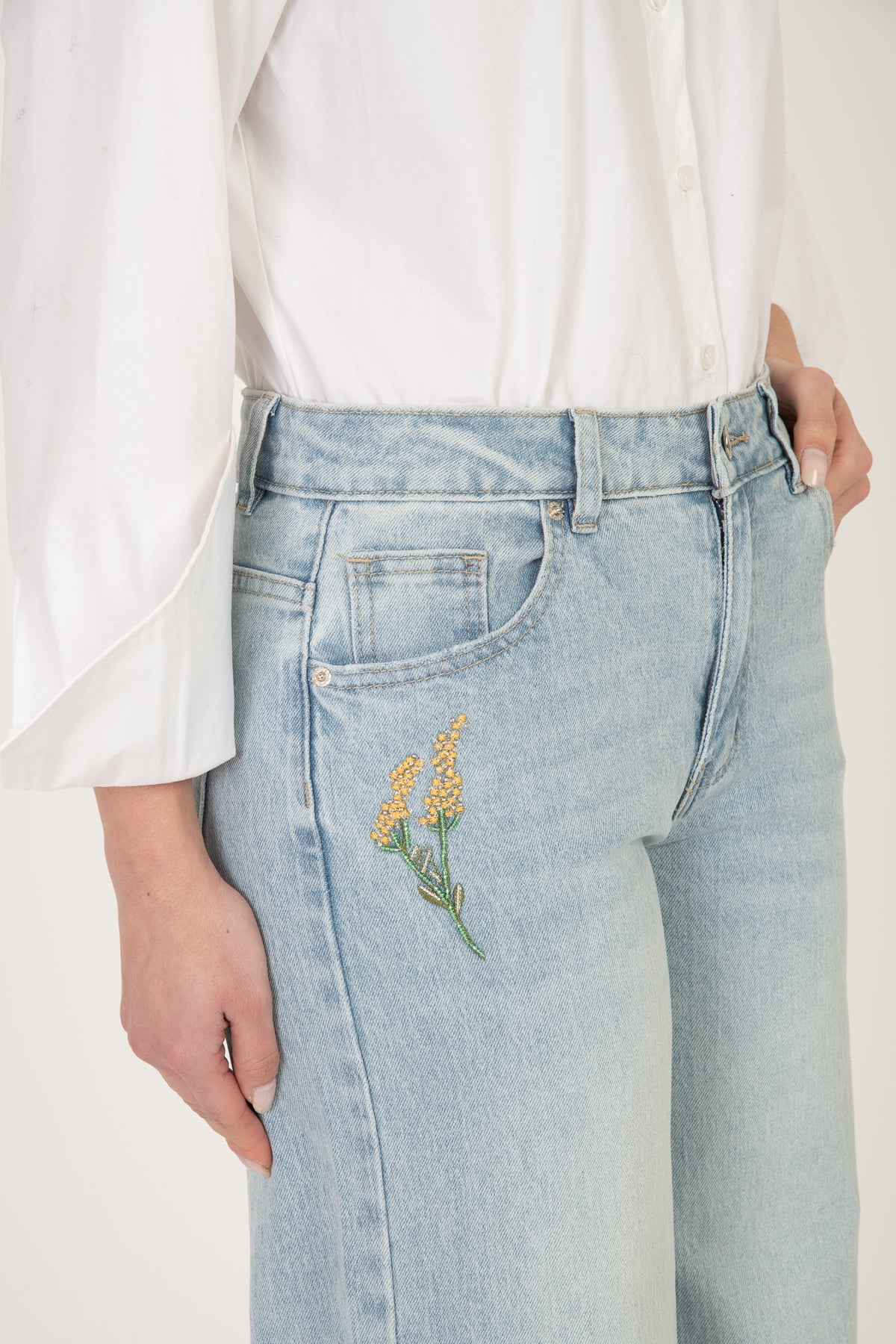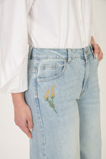 Jeans poco elasticizzato, vita alta chiusura zip e bottone, dettaglio fiori ricamati sul fondo con perline, per un effetto più morbido consigliamo una taglia in più, altrimenti acquistare la taglia solita.