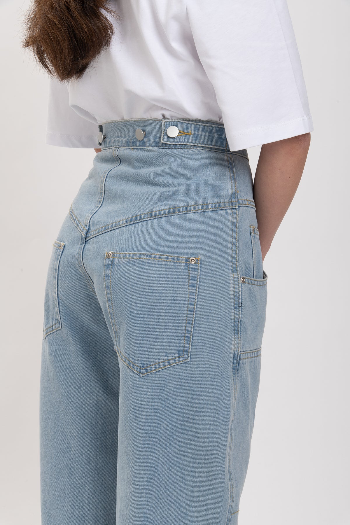 Il Jeans è leggermente elasticizzato, vita alta con bustino con chiusura bottoni,consigliamo la taglia regolare, per un effetto come in foto piu morbido acquistare una taglia in piu, gamba morbida ed ampia con maxi tasconi, vita alta, chiusura zip e bottone, cuciture sul davanti. Sul retro è regolabile con bottoni.