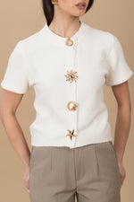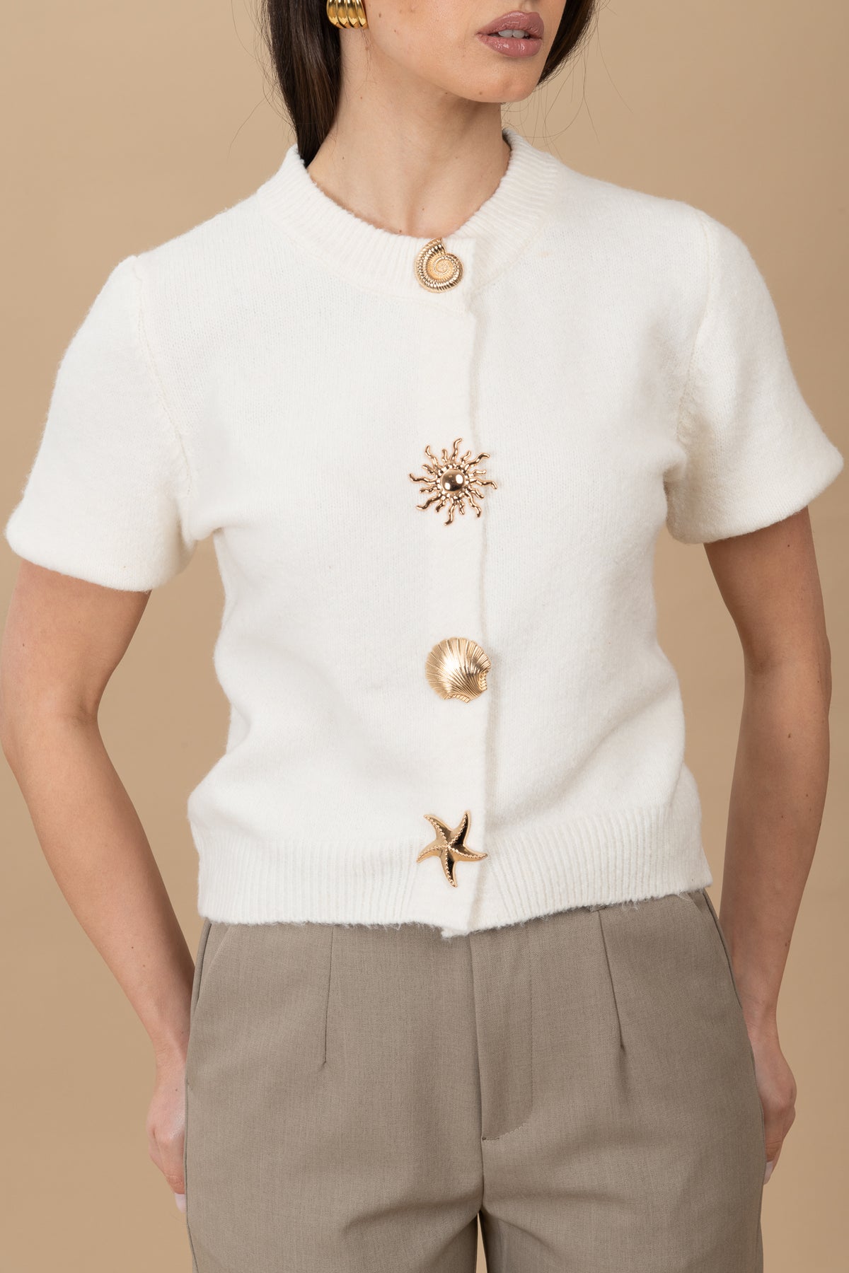 Cardigan taglia unica, lunghezza leggermente crop ,elasticizzato, girocollo e dettaglio bottoni conchiglie oro, veste da una taglia Xs ad una L abbondante.