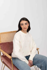 Maglione taglia unica lunghezza regolare, dettaglio mini fiocchetti ricamati sul davanti, girocollo ed elastico sul fondo.