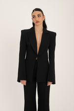 Blazer avvitato con chiusura gancetto sul davanti, spalline interne, bottoni finiti sul polso, tasche finte, foderato internamente e poco elastico, spacco sul retro.