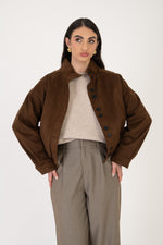 Bomber lunghezza leggermente crop , elastico sul fondo, foderato internamente , chiusura bottoni, tasche vere laterali ,collo alto a pistagna,bottoni al polso.