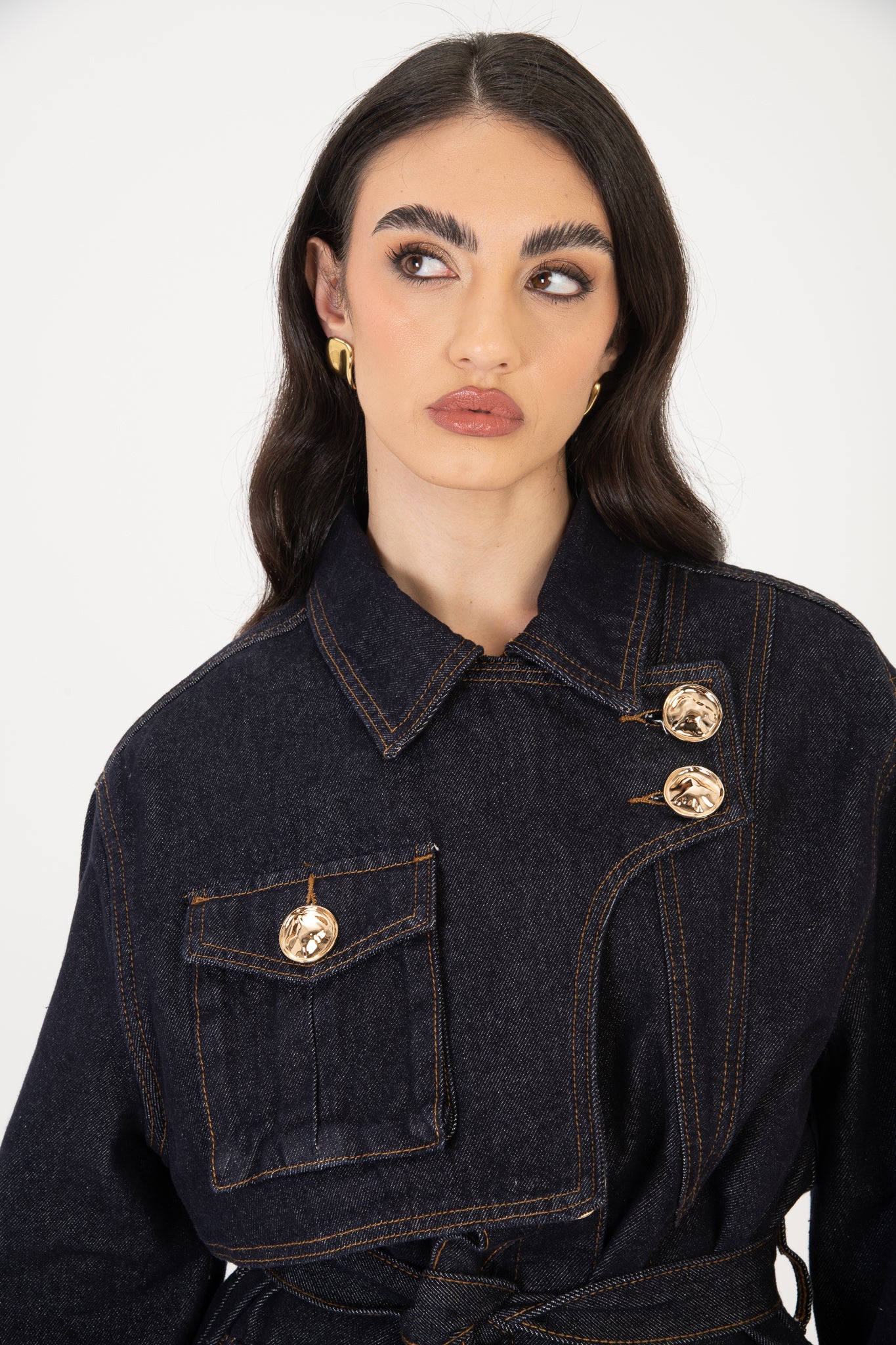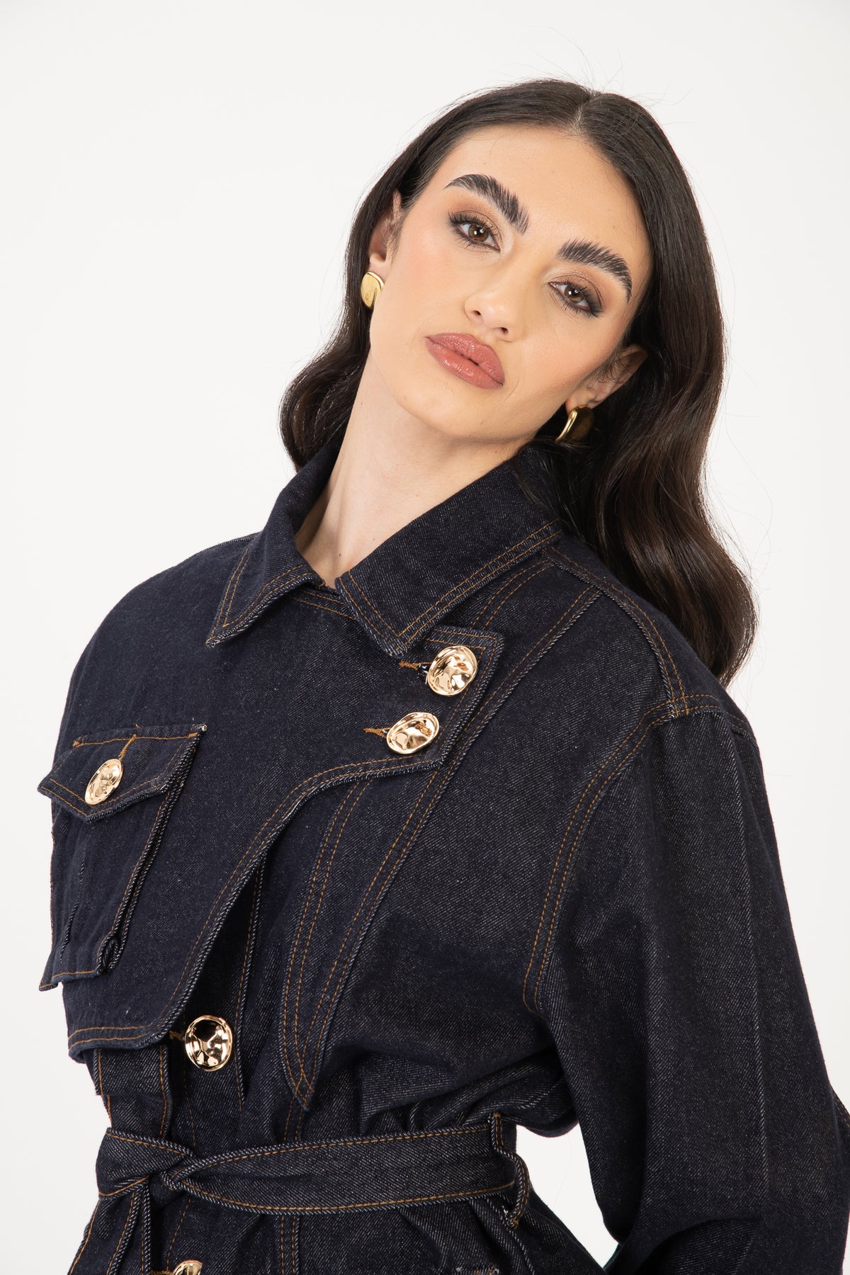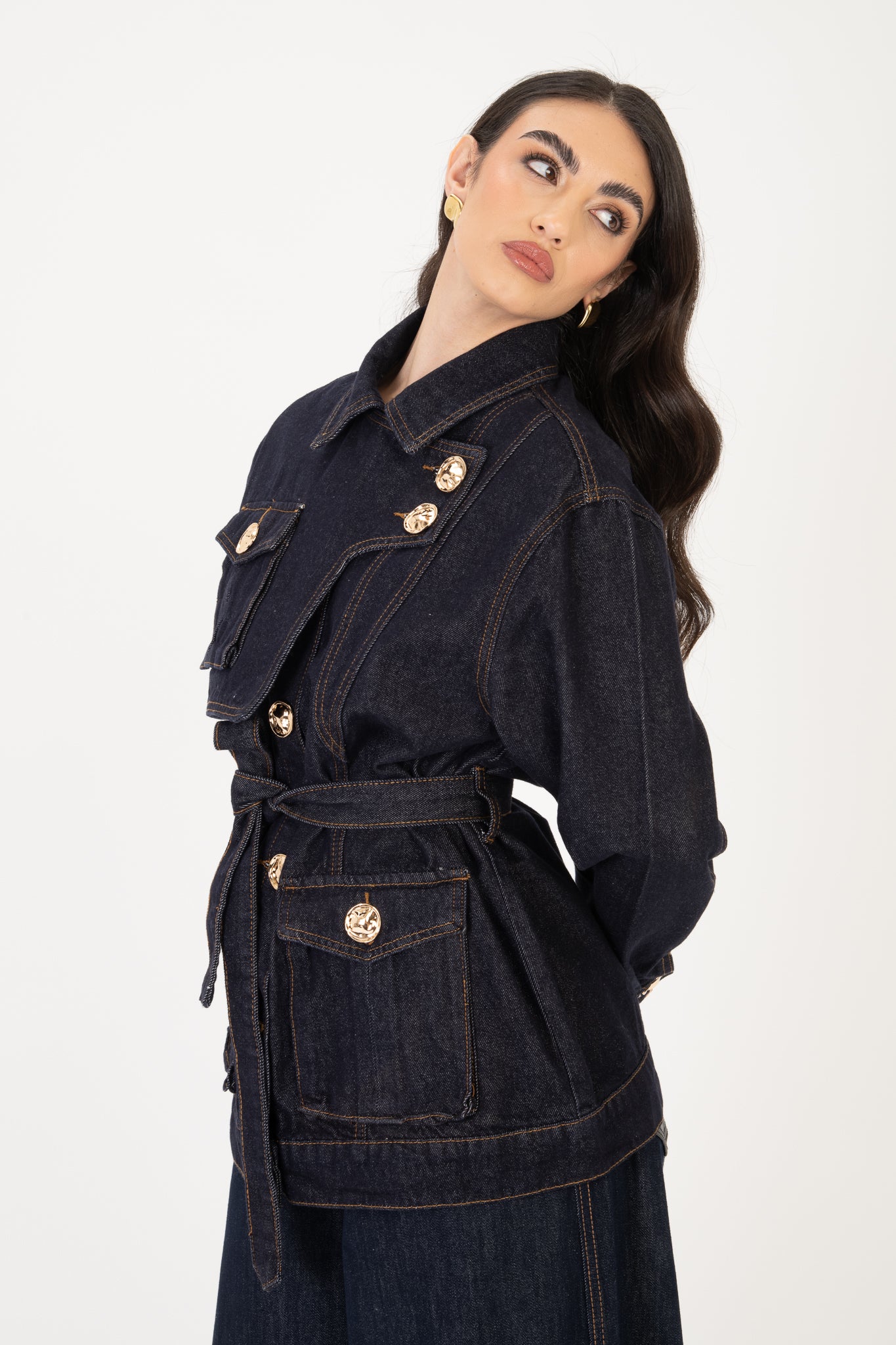 La giacca/Camicia è taglia unica, lunghezza regolare , chiusura bottoni oro , tasche vere sul davanti, dettaglio asimmetrico sul petto, passanti e cintura tono su tono inclusa.