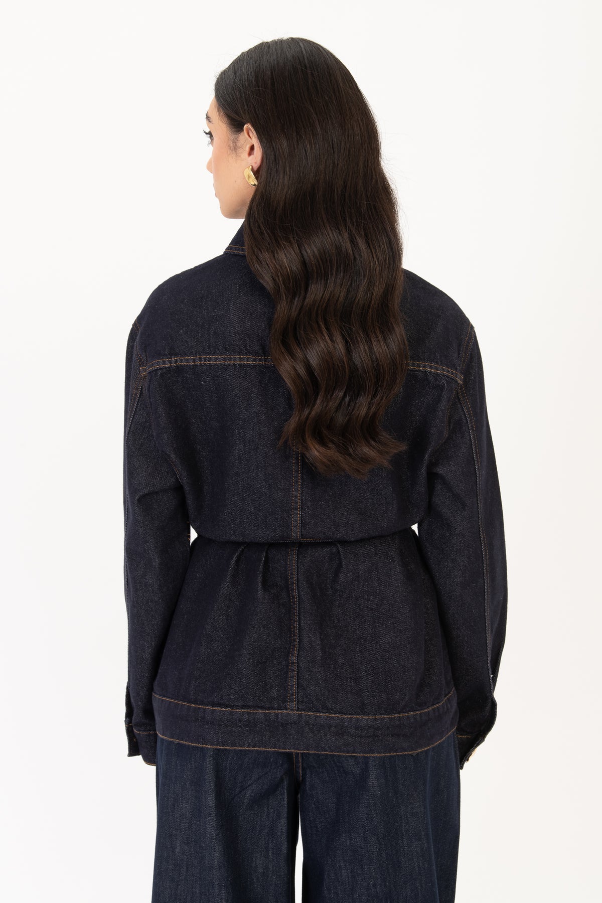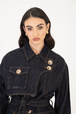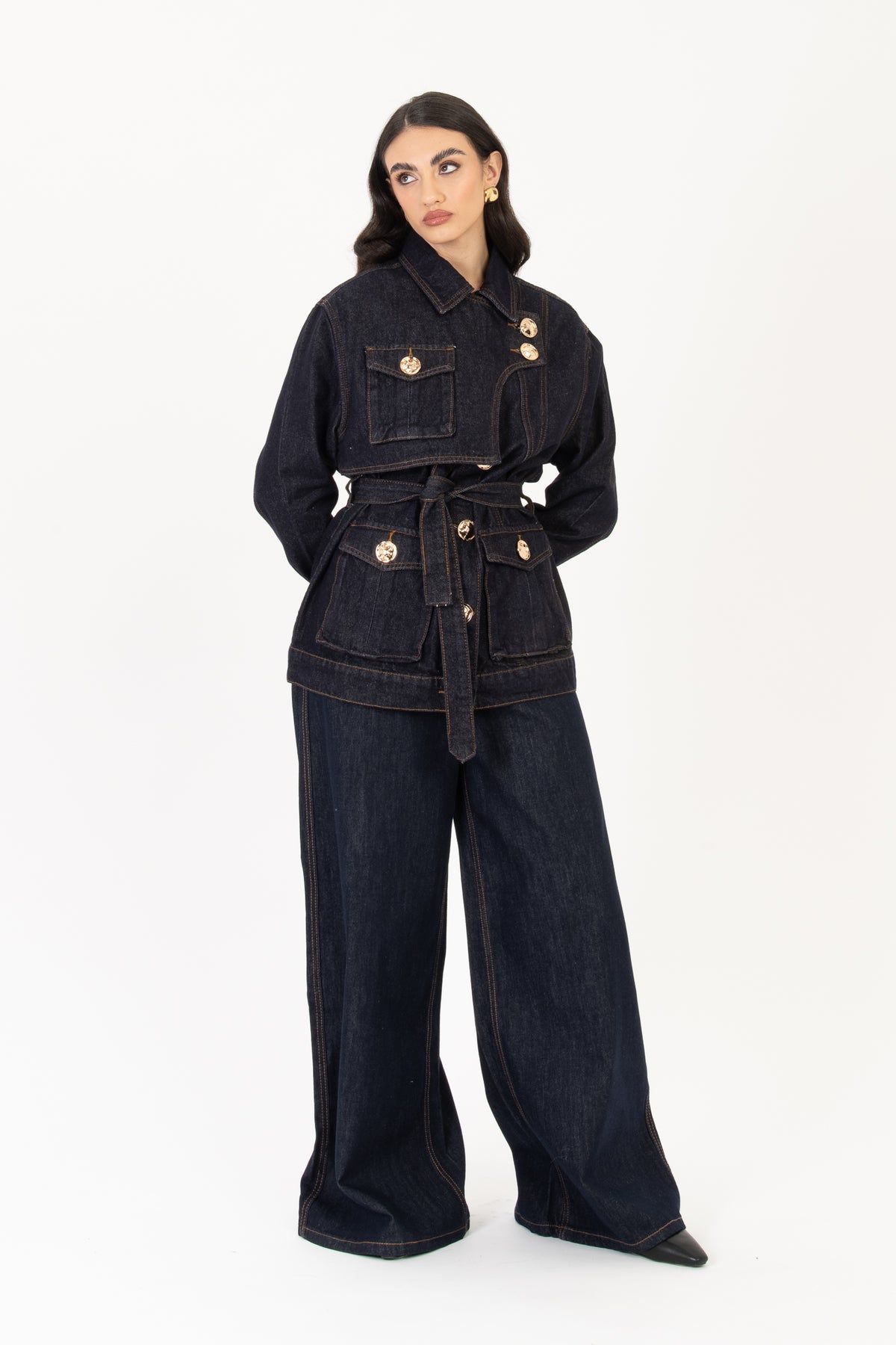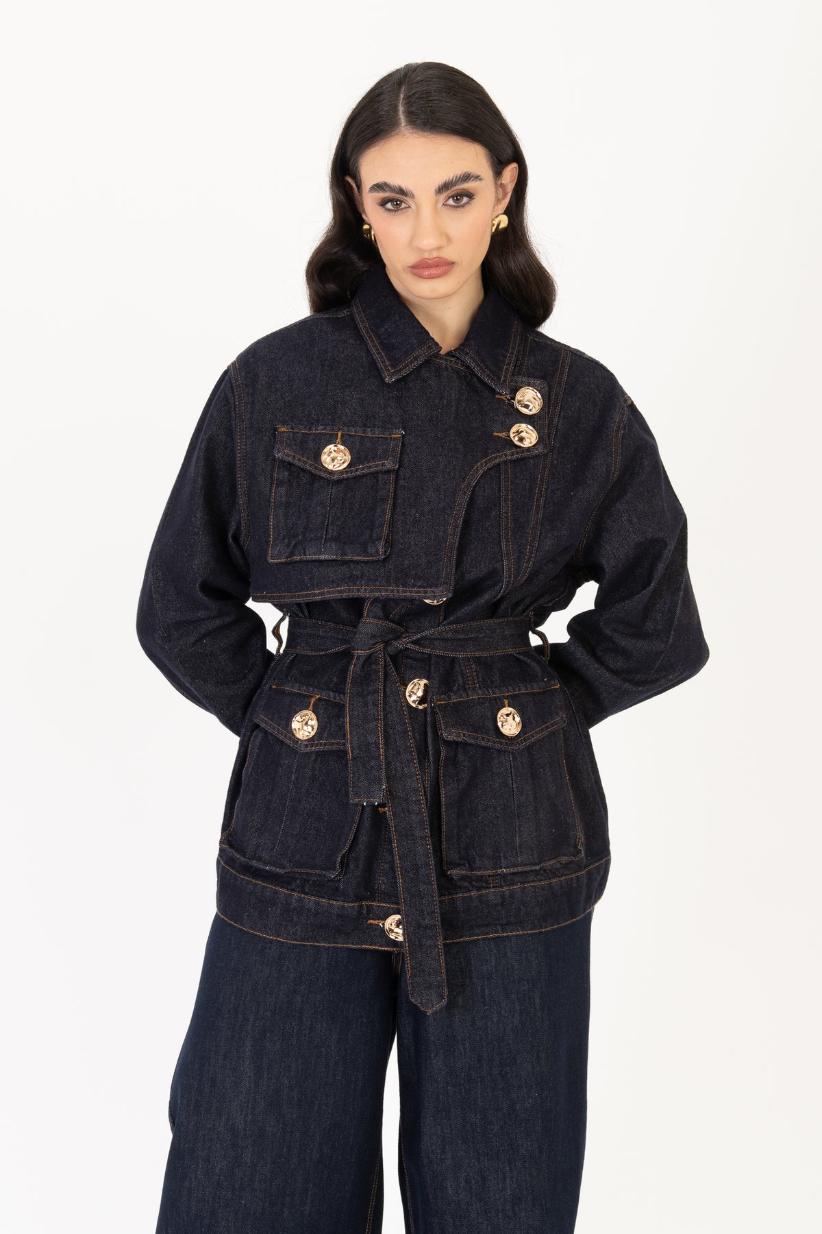 La giacca/Camicia è taglia unica, lunghezza regolare , chiusura bottoni oro , tasche vere sul davanti, dettaglio asimmetrico sul petto, passanti e cintura tono su tono inclusa.