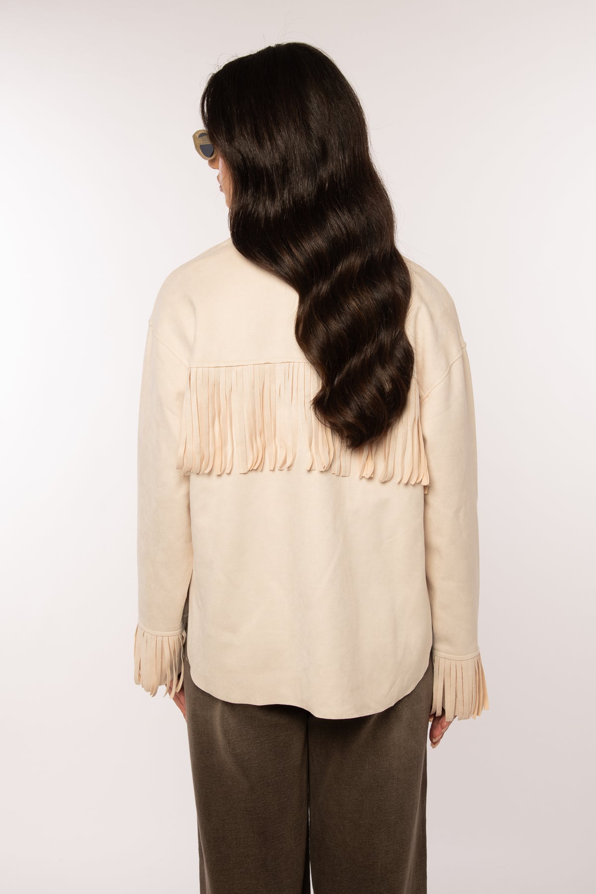 Camicia lunghezza regolare, elasticizzata adatta anche alle più alte, dettaglio frange tono su tono sul davanti, bottoni a ciappa sia sul davanti sia sul
