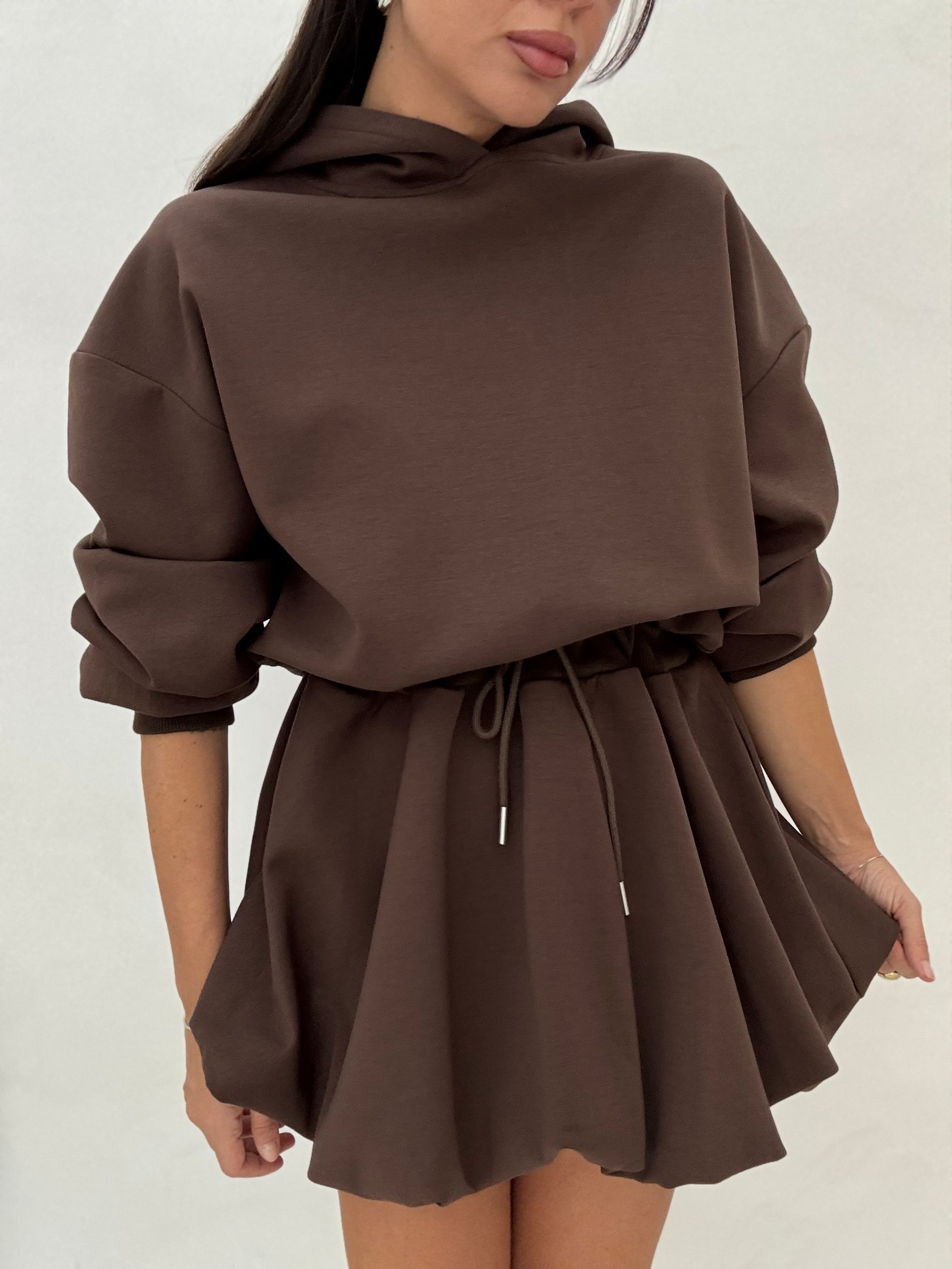 Roberta è alta 1,63 e solitamente indossa taglia XS. L’abito è taglia unica veste da una XS ad una L regolare, leggermente elasticizzato. La parte superiore del abito è una felpa con cappuccio, manica lunga con elastico in vita regolabile. Il sotto dell’abito è una gonnellina ballon.