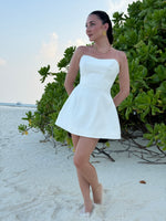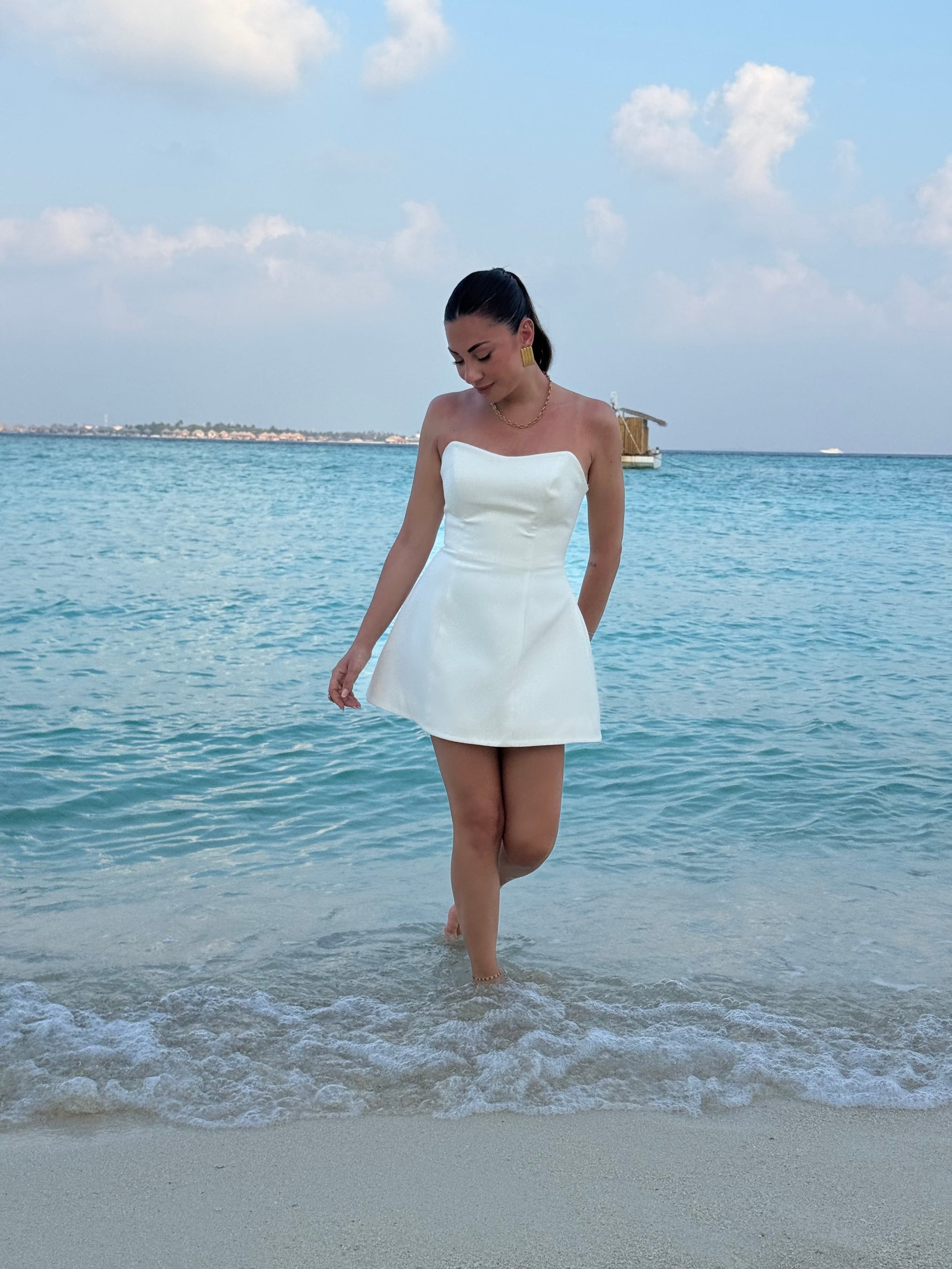 Abito con chiusura zip sul retro, non elasticizzato, scollo a cuore internamente steccato, effetto avvitato, interamente foderato.