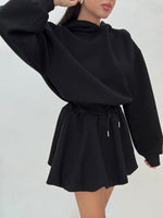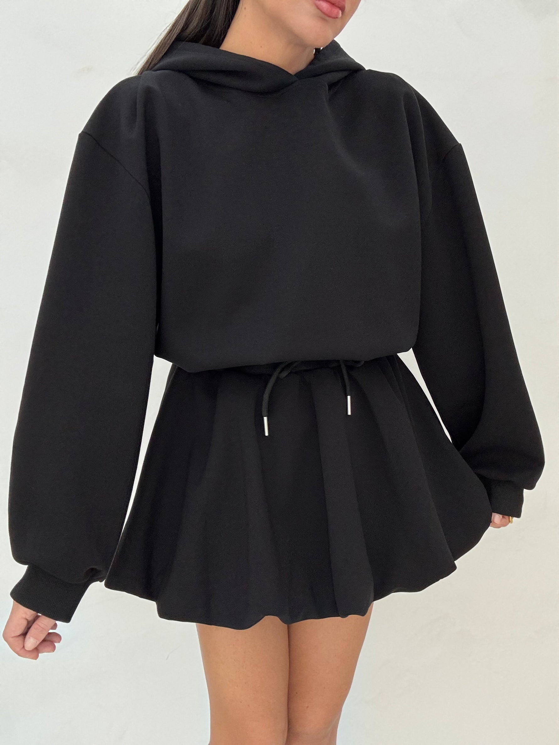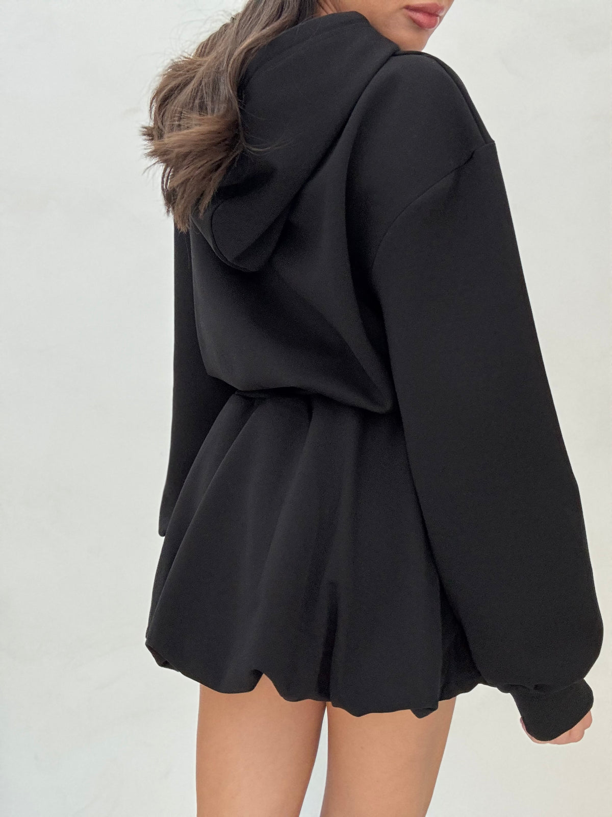 Roberta è alta 1,63 e solitamente indossa taglia XS. L’abito è taglia unica veste da una XS ad una L regolare, leggermente elasticizzato. La parte superiore del abito è una felpa con cappuccio, manica lunga con elastico in vita regolabile. Il sotto dell’abito è una gonnellina ballon.