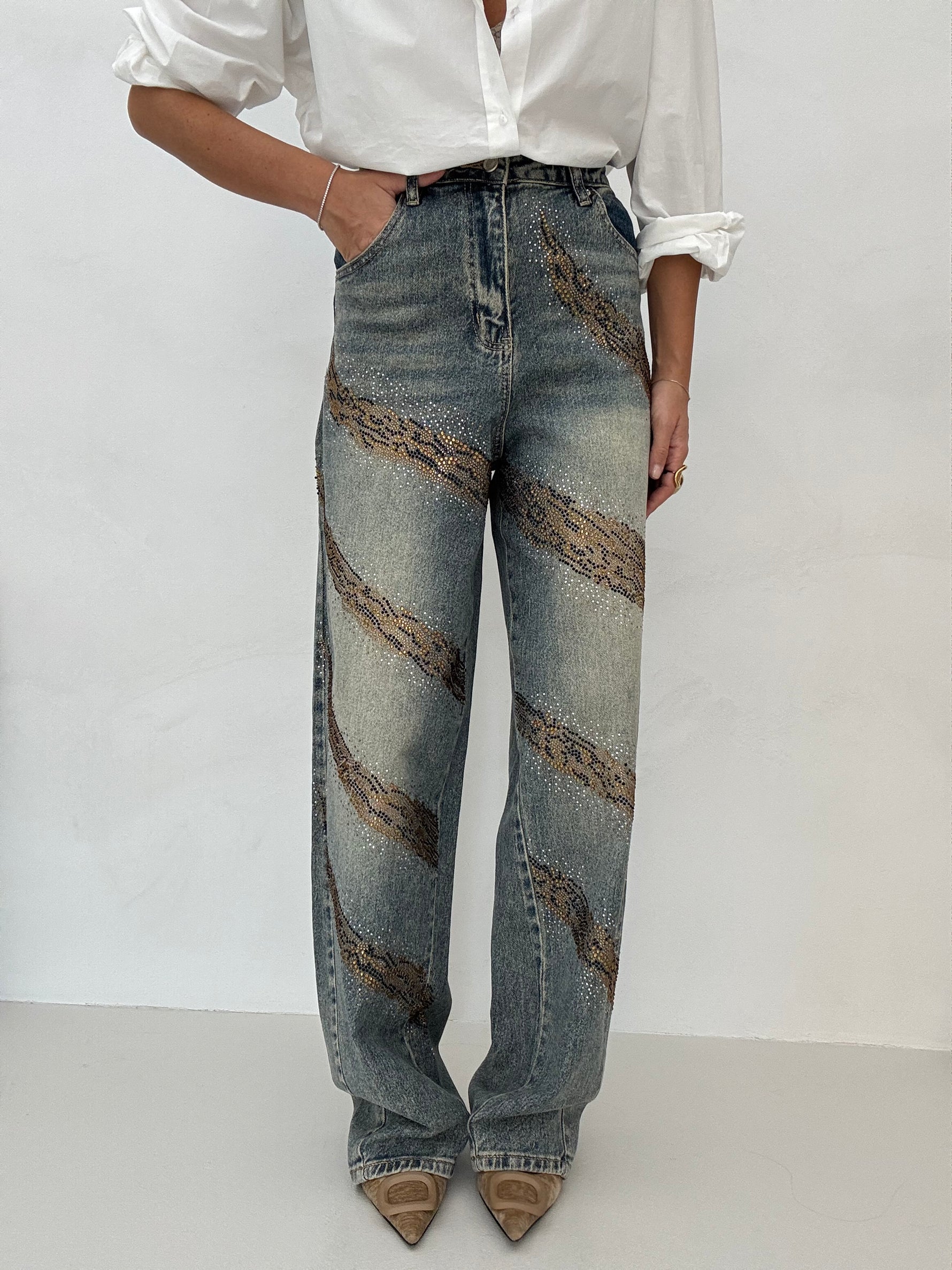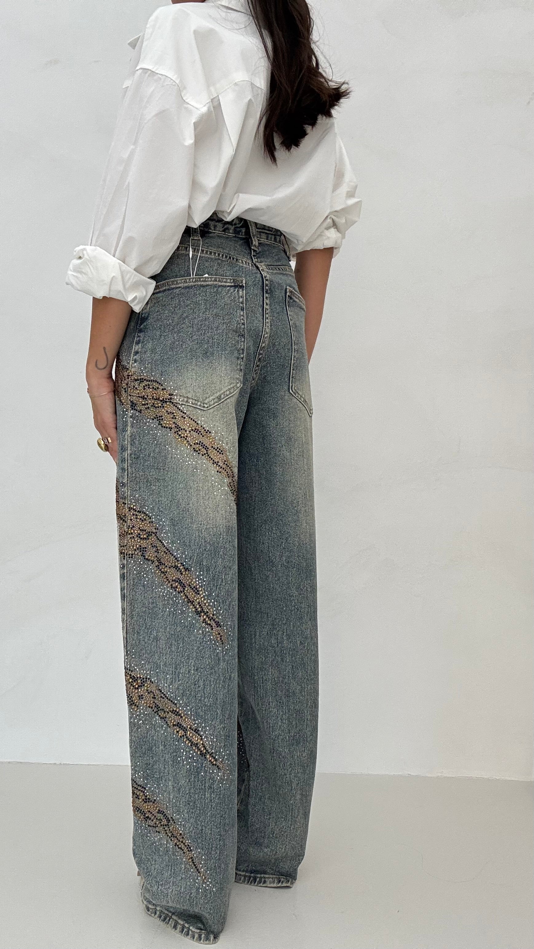 Jeans vita alta non elasticizzato, gamba larga con caviglia leggermente stretta, strass sul davanti e sul retro solo alla gamba destra, chiusura con bottone e zip, tasche vere sul retro e sul davanti.