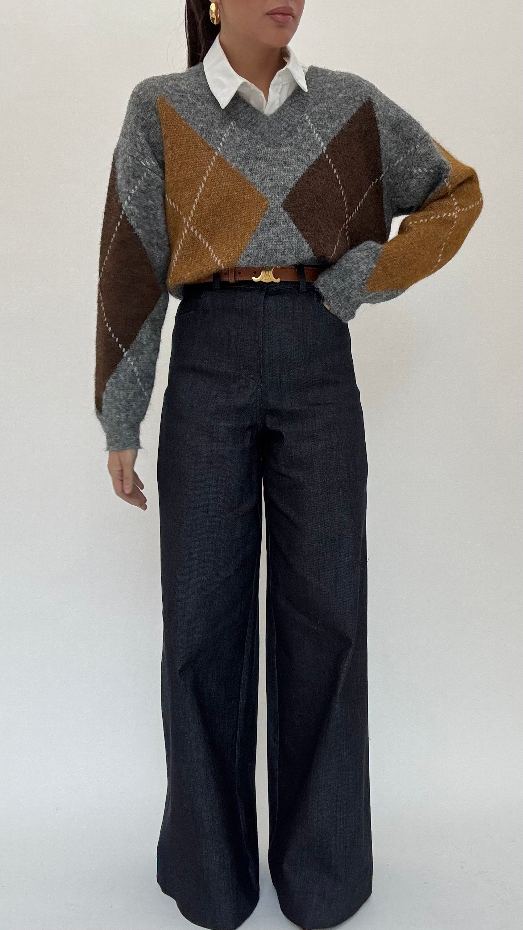 Pantalone vita alta, leggermente elasticizzato e non foderato interamente, gamba morbida e leggermente palazzo, chiusura con zip e bottone, passanti.