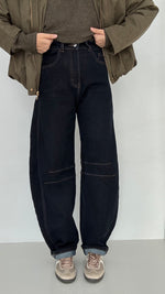 Jeans vita alta poco elasticizzato, gamba larga, effetto ballon chiusura con bottone e zip, tasche vere,con dettaglio cucitura sul ginocchio ,per un effetto più morbido acquistare una taglia in più.