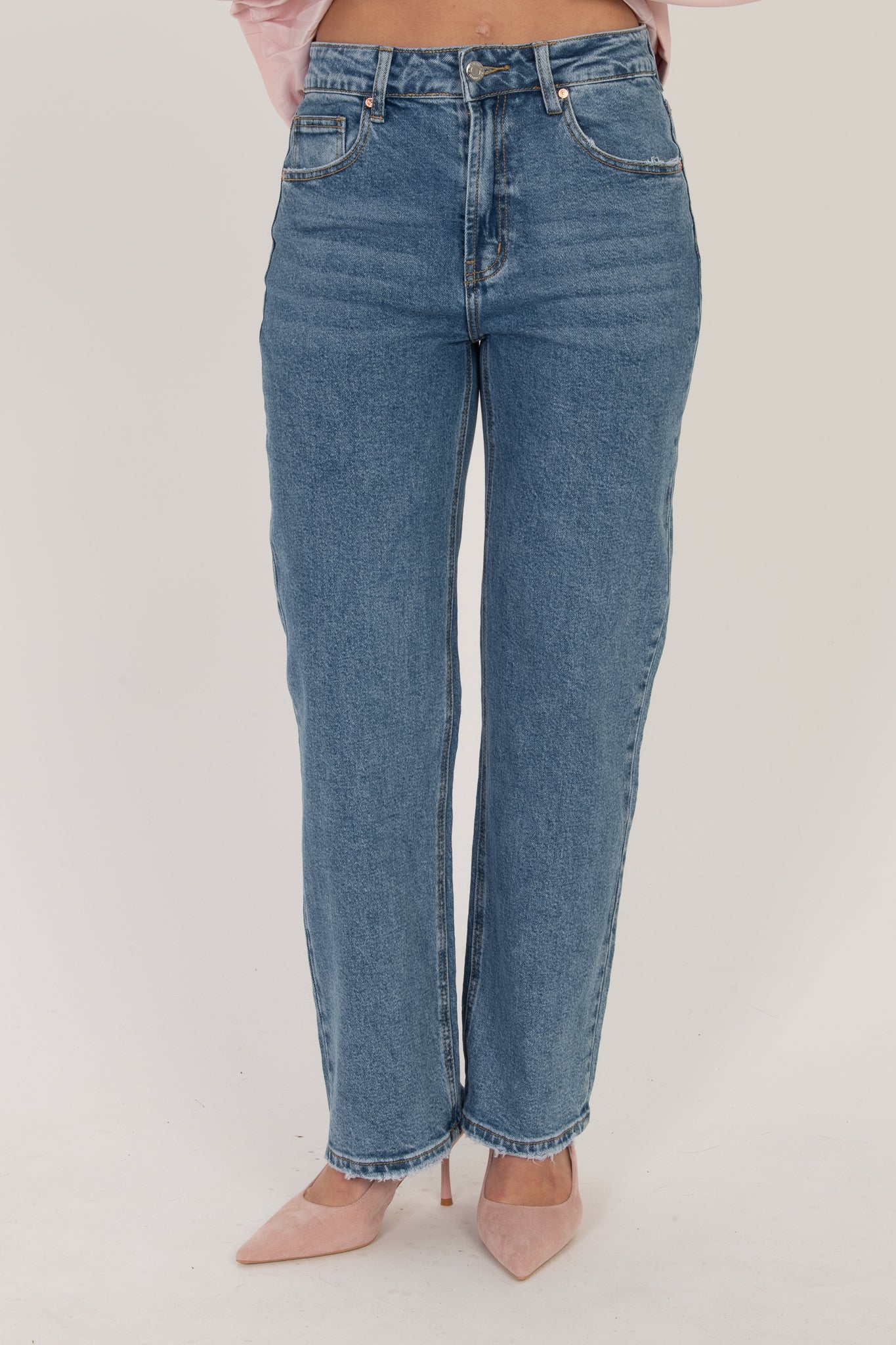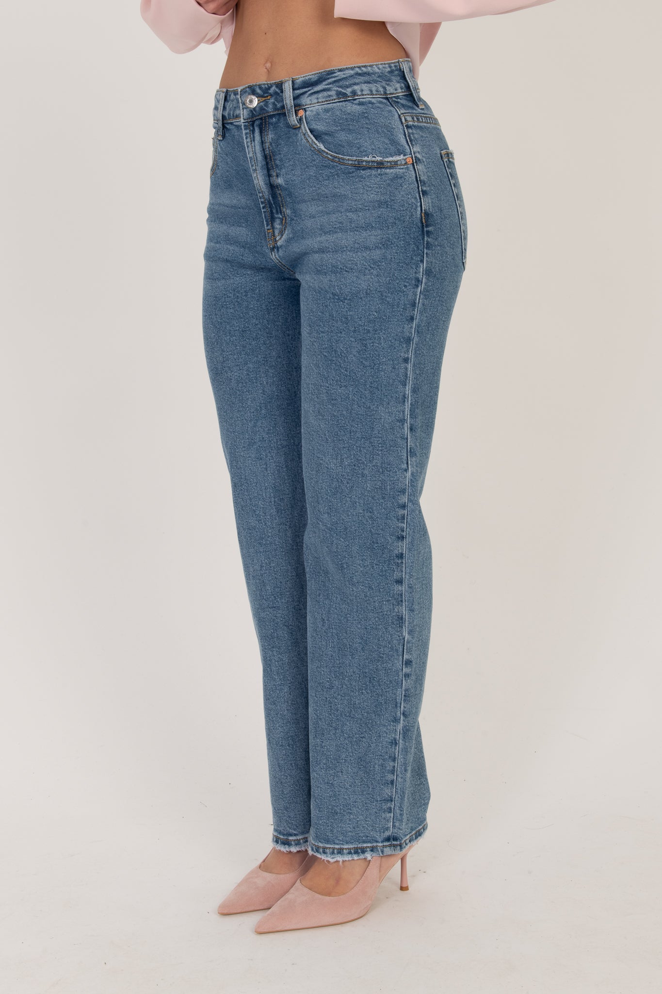 Jeans vita alta non elasticizzato per questo la modella indossa una taglia in più la M perché è tela rigida gamba dritta, chiusura con bottone e zip, tasche vere, leggermente sfrangiato sul fondo ,per un effetto più morbido acquistare una taglia in più.