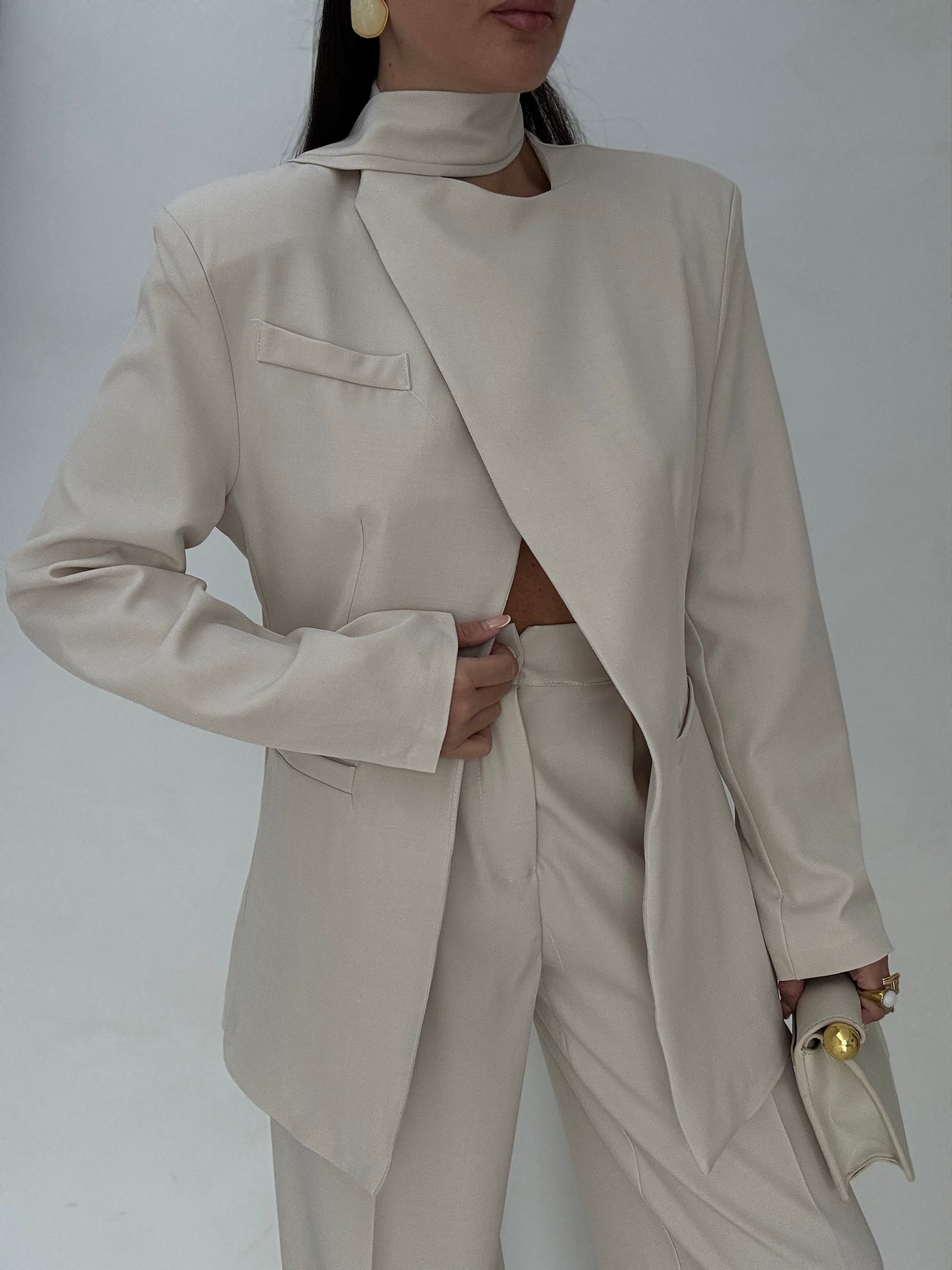 Blazer lunghezza regolare , foderato internamente, chiusura con bottone sul davanti e tasche finte sul petto,spalline interne, pence sul davanti con fusciacca asimmetrica.