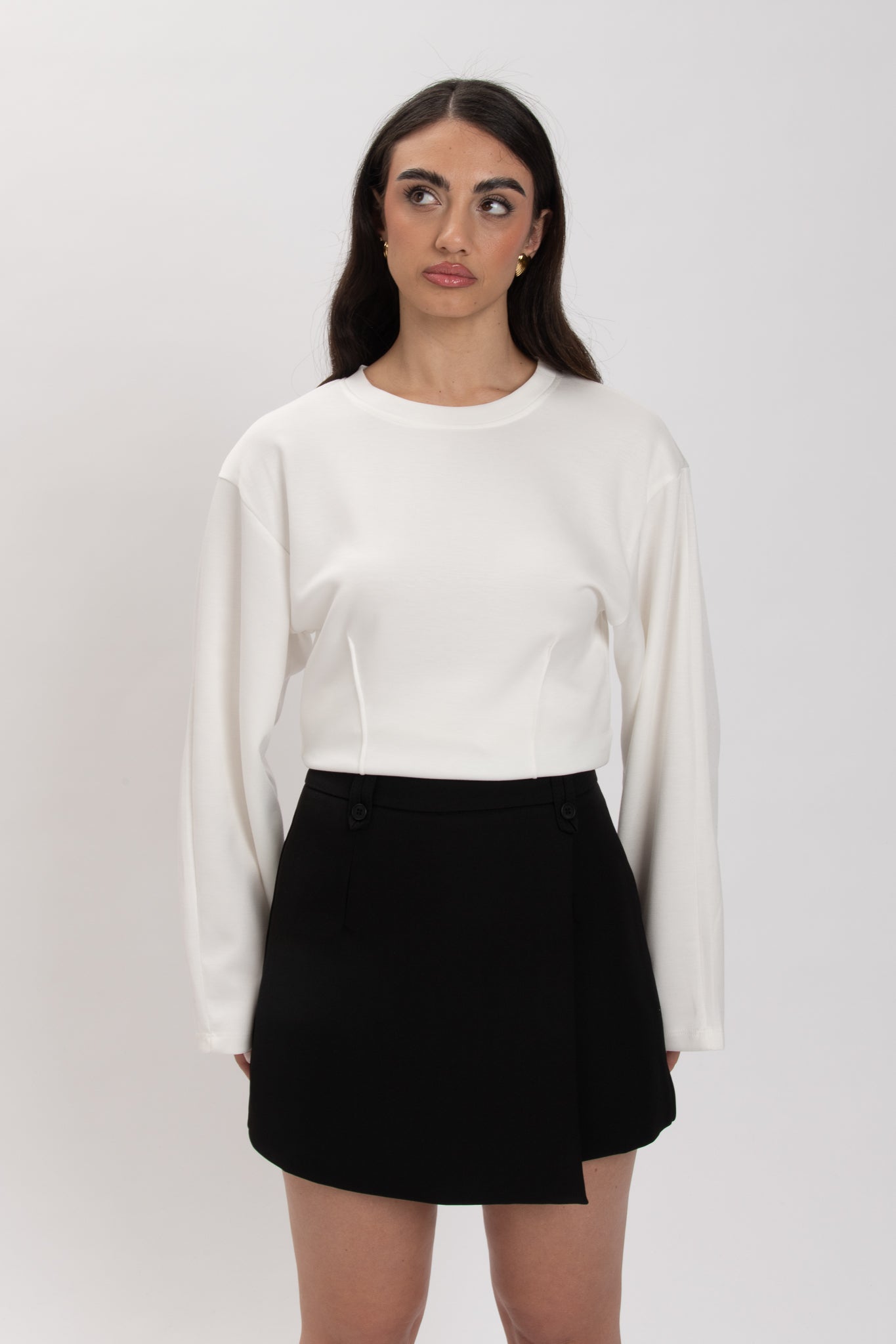 Gonna/pantaloncino chiusura zip sul retro,cintura inclusa, gonna/pantaloncino internamente foderata, non elasticizzata, passanti e mini bottoni sul davanti.