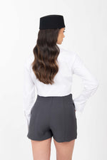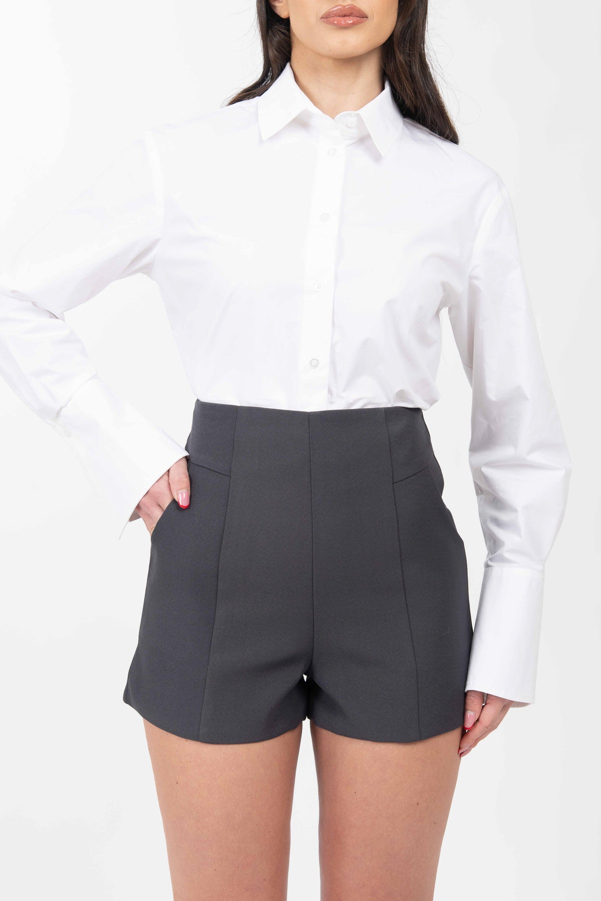 Pantaloncino tela rigida strutturato, non elasticizzato, chiusura zip super retro, non ha tasche, internante foderato, si consiglia l’acquisto di una taglia in più.