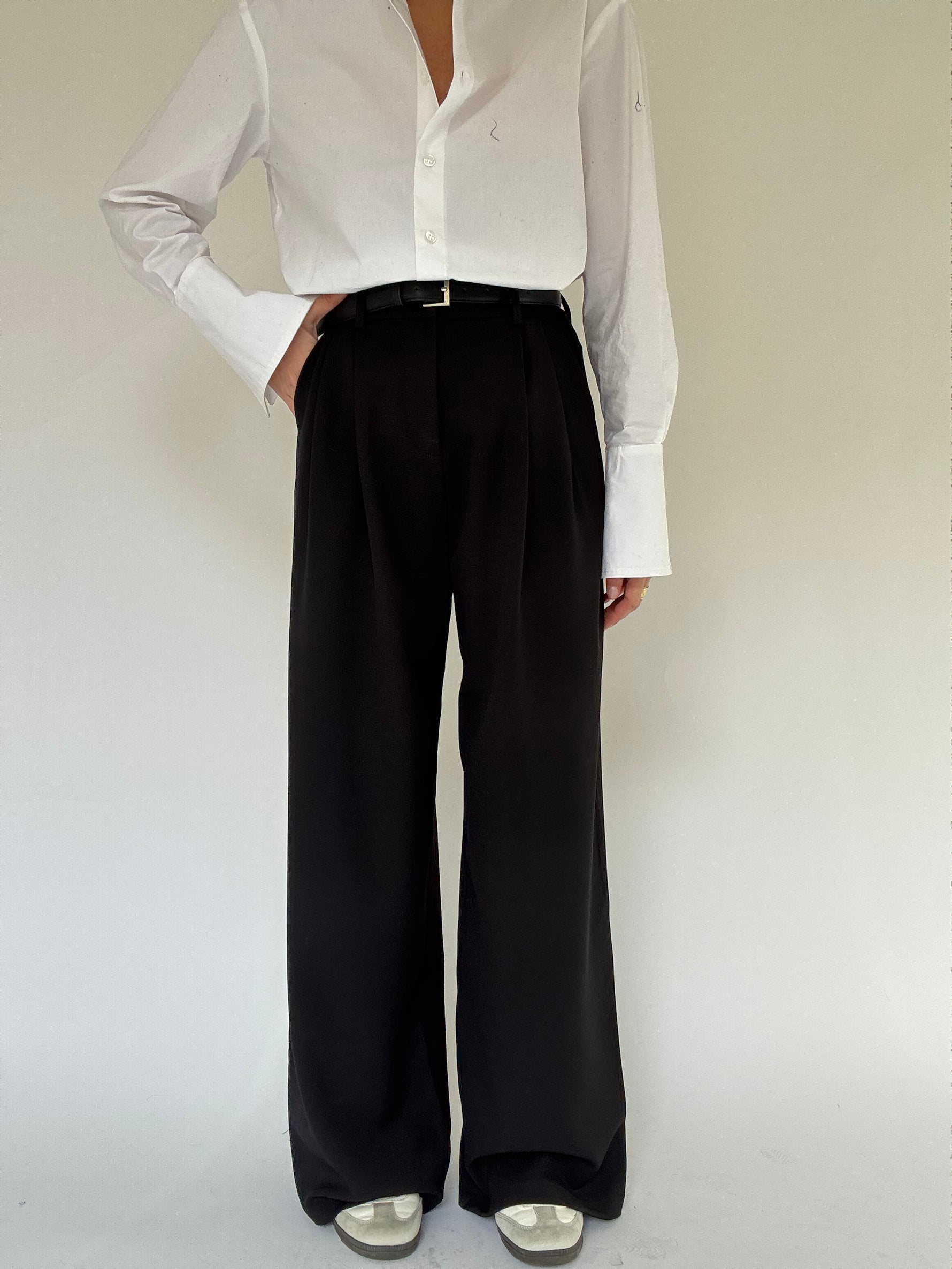 il pantalone è vita alta con tasche vere sul davanti a scomparsa, mentre sul retro sono finte, chiusura gancetto e zip,gamba morbida leggermente palazzo,cintura inclusa, poco elasticizzato consigliamo una taglia in più.