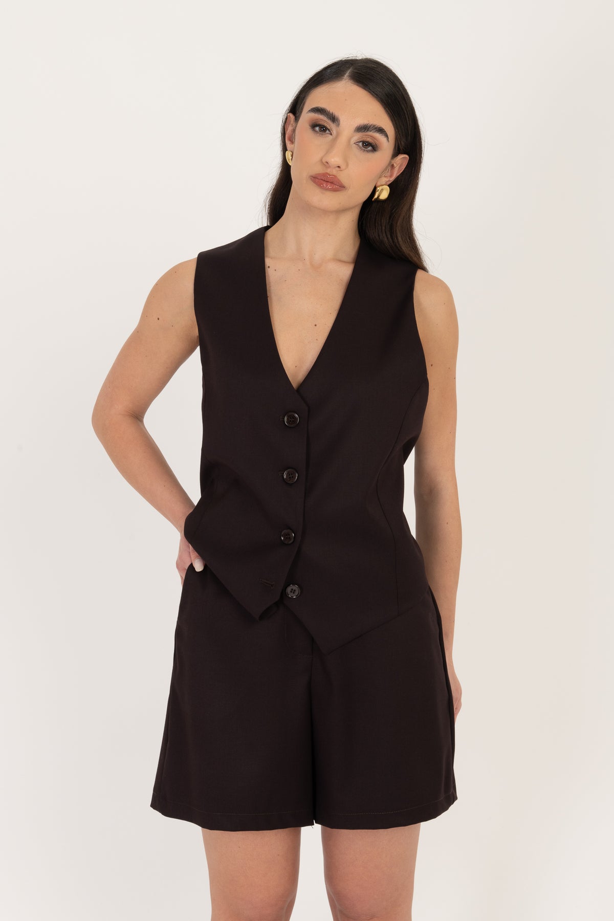 Robi è alta 1.63, solitamente indossa taglia XS, il bermuda veste regolare, ha la chiusura con bottone e zip, per un effetto più morbido acquistare una taglia in più.