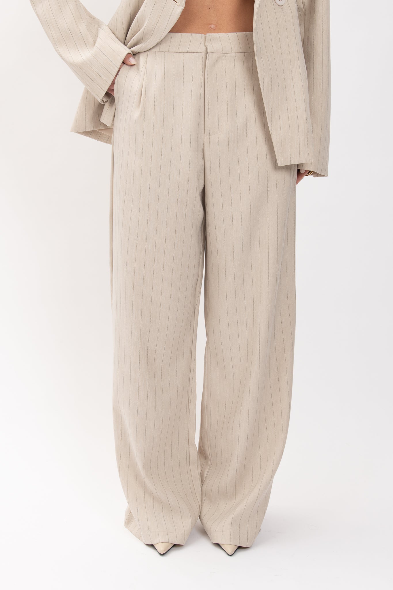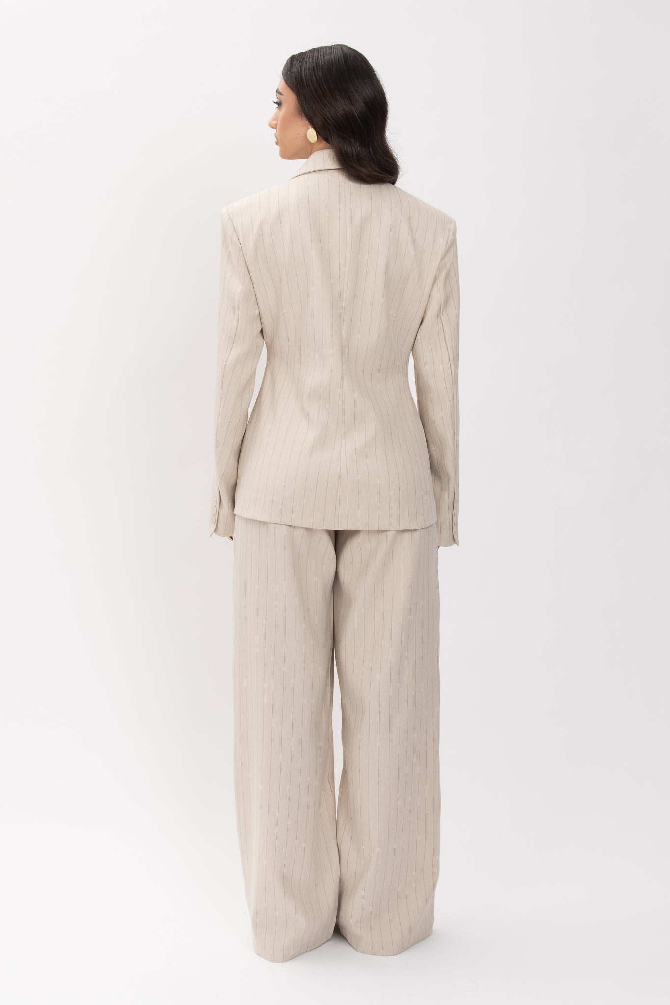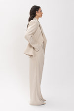 Il pantalone è a palazzo con pence, la chiusura presenta un bottone interno, tasche laterali vere, taschini sul retro finti.