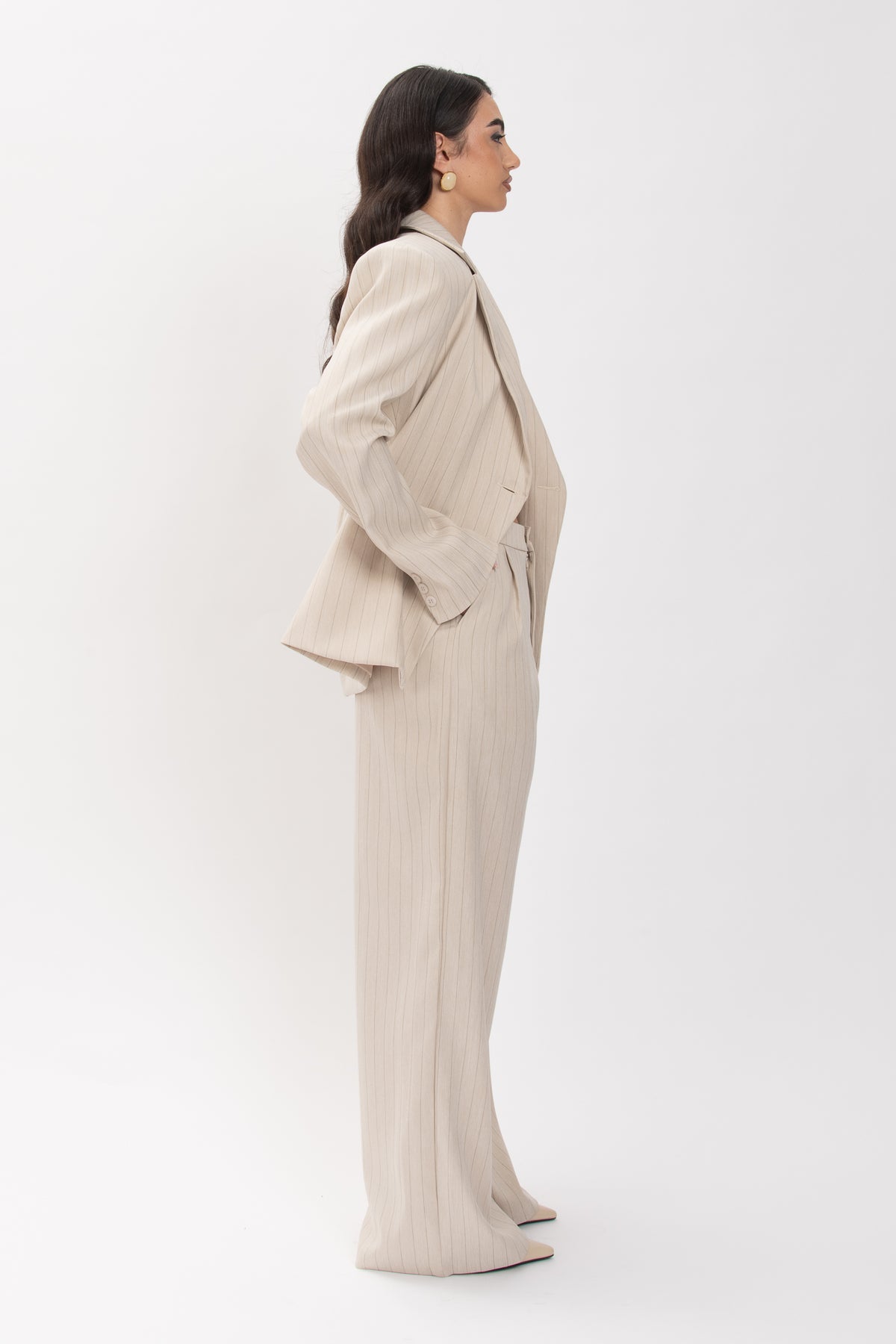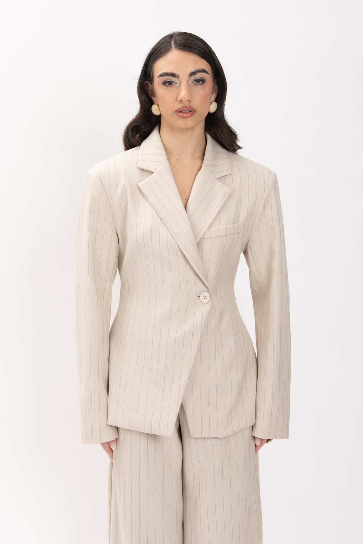 Tailleur composto da blazer con spallina interna, avvitato, chiusura asimmetrica con bottone esterno ed interno, taschino finto e bottoni finti sulle maniche.