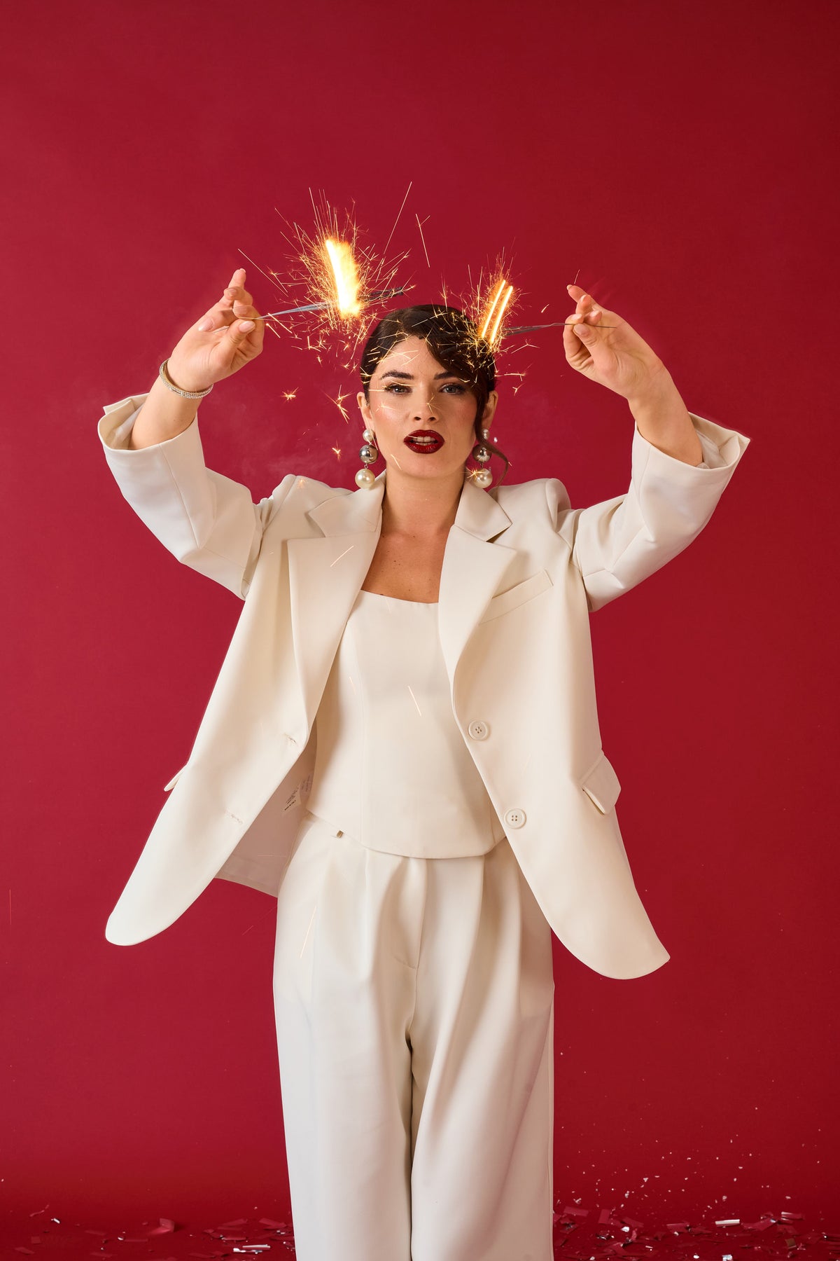 Roberta è alta 1.63, solitamente indossa taglia XS, del tailleur indossa taglia XS. Carmela è alta 1.75 e indossa taglia S.